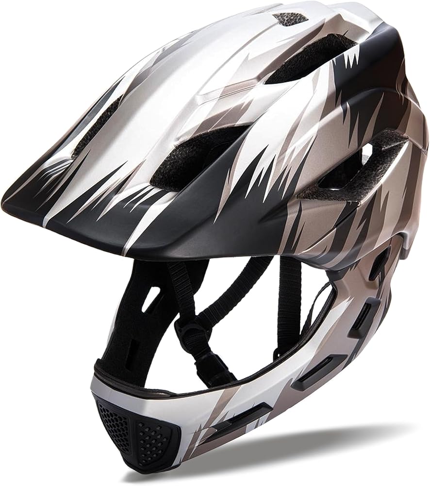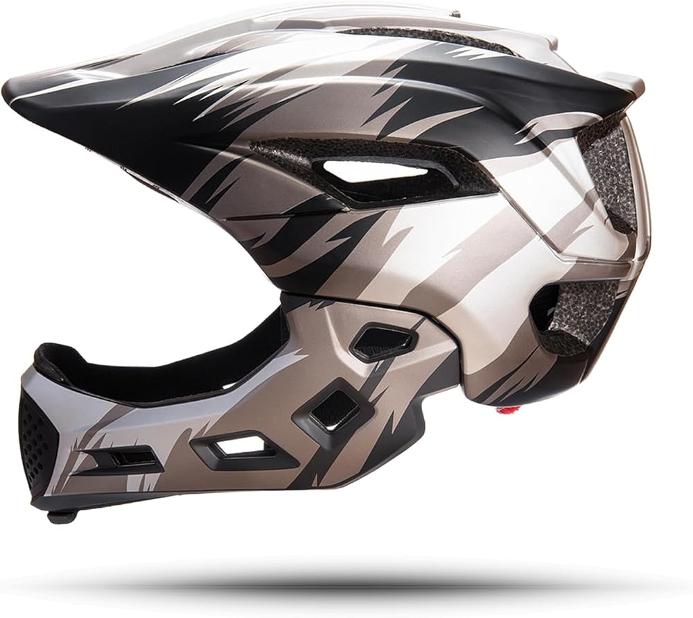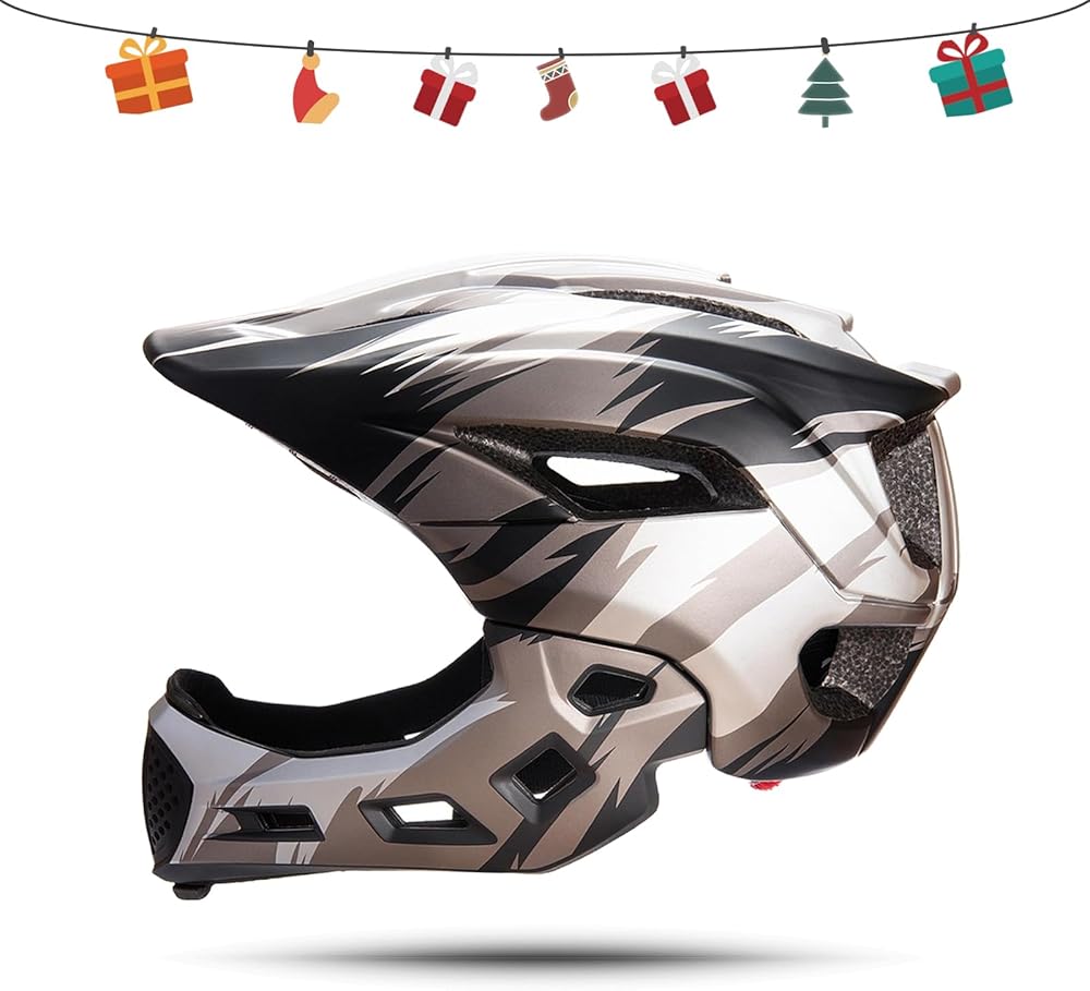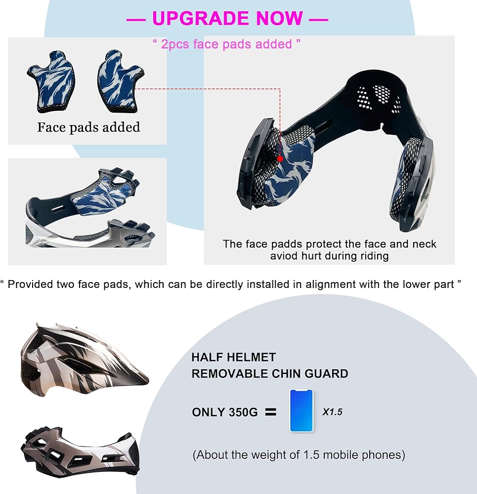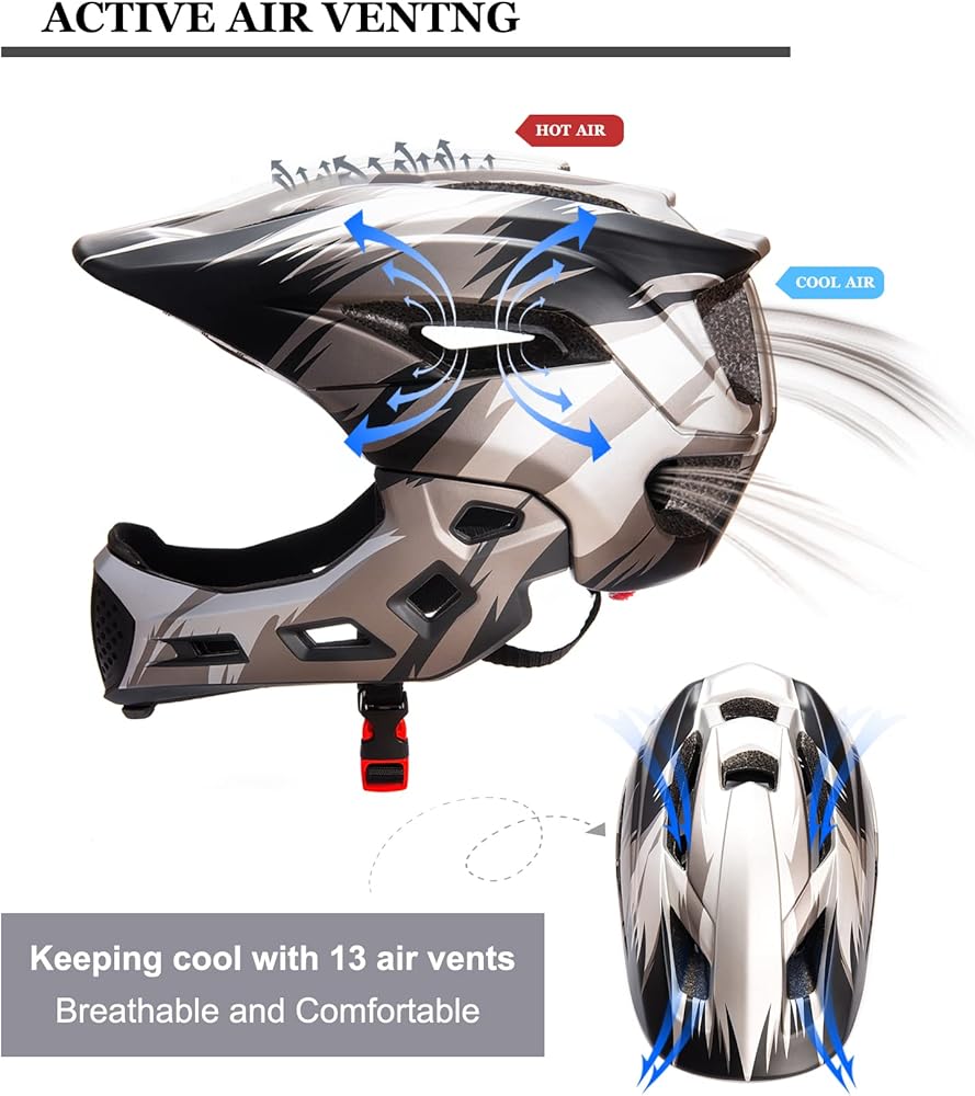 【❤ 2 IN 1 Helmet】Half helmet and full helmet transform freely. The chin bar easily detached and equipped via moving both side of button.Half helmet is better suited to slow sports like cycling scooter...... full helmet is may apply to younger kids outdoor sports , very amazing look.Very secure and highly protective.
