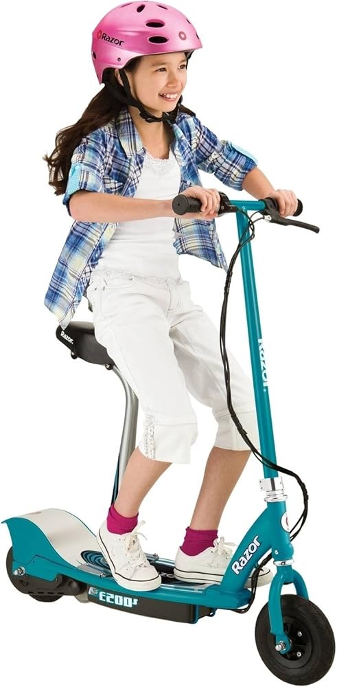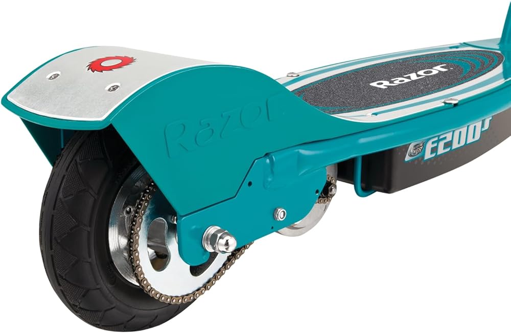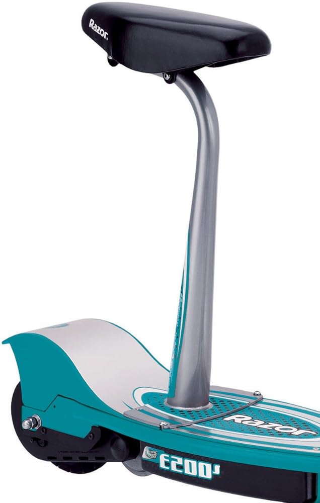*The E200 electric scooter has a full-sized deck and frame and other upgrades for smooth rolling *Seat post and padded seat easily remove for stand-up riding *Speeds up to 12 mph (19 km/h) *Up to 40 minutes of continuous use *High-torque, chain-driven motor *Twist-grip throttle *Hand-operated rear brake *Steel frame/fork *Soft rubber grips *Full-sized deck *Steel wheels with 8" pneumatic tires *Retractable kickstand *24V (two 12V) sealed lead acid rechargeable battery *Includes battery charger *154-lb. weight capacity *Ages 13+ *90-day limited manufacturer warranty