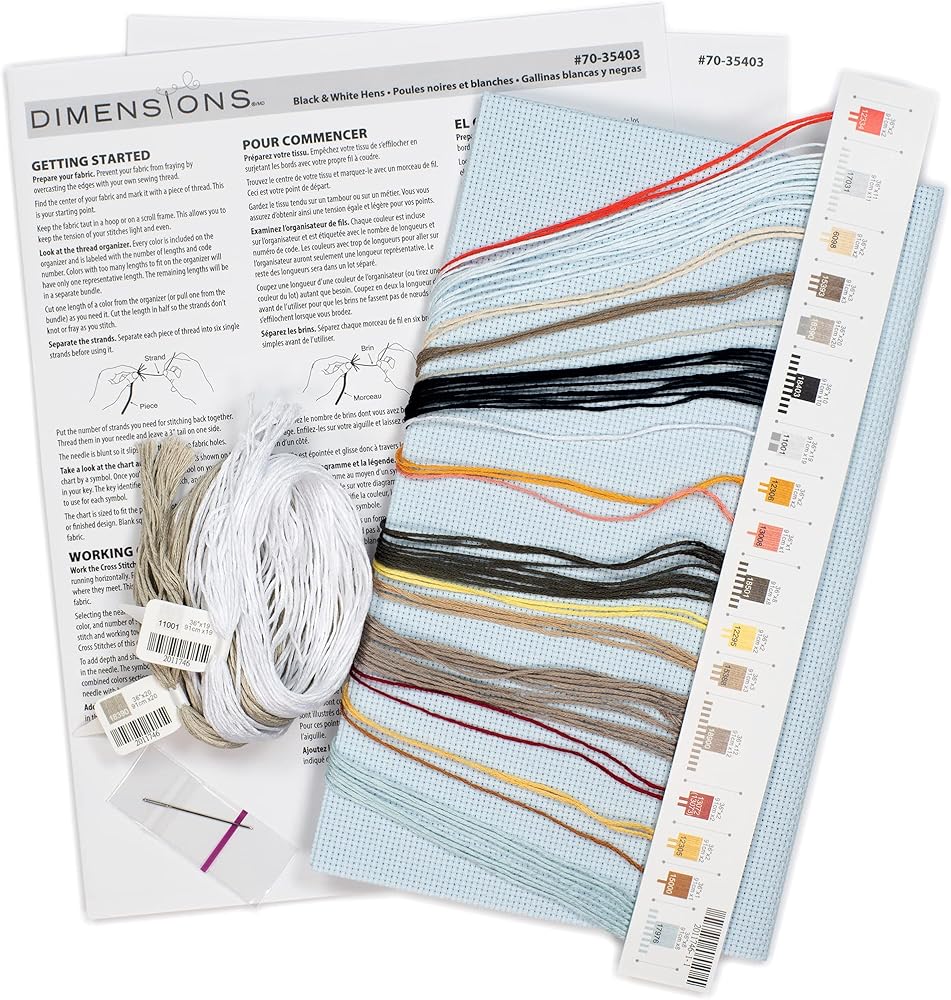 Dimensions counted cross stitch kit contains presorted thread, 14 count lt. blue Aida, needle and instructions.