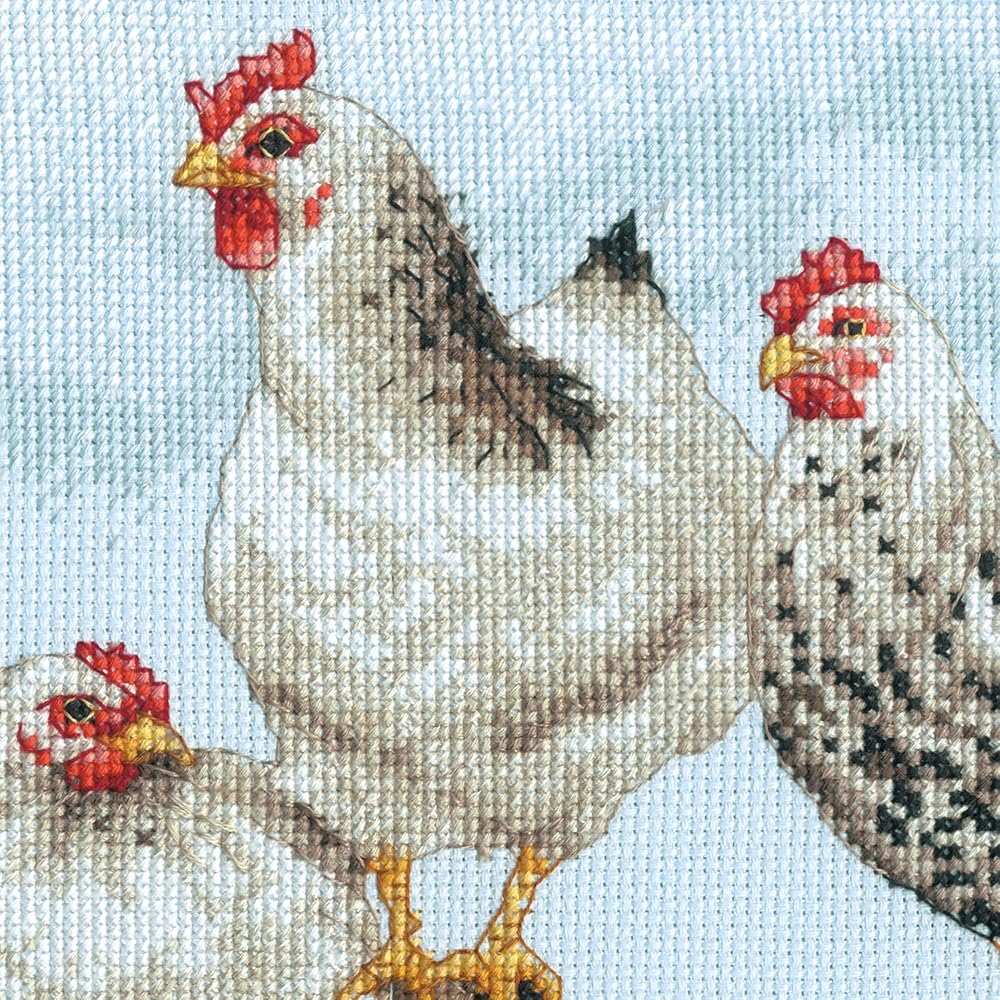 A colorful clutch of cluckers gather on a fence in this counted cross stitch set.
