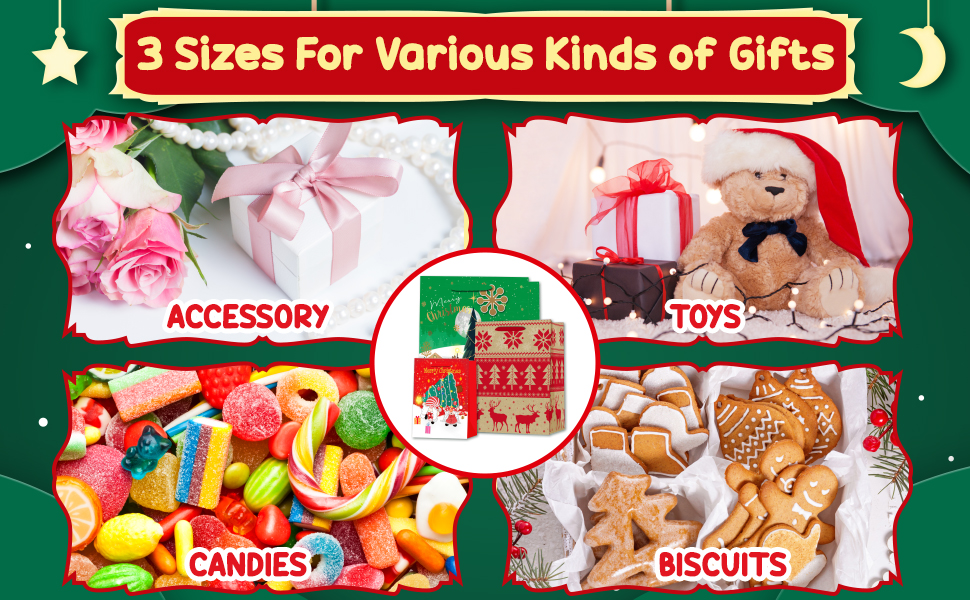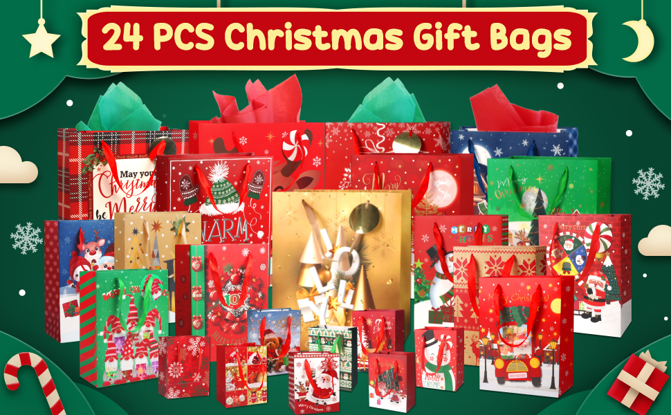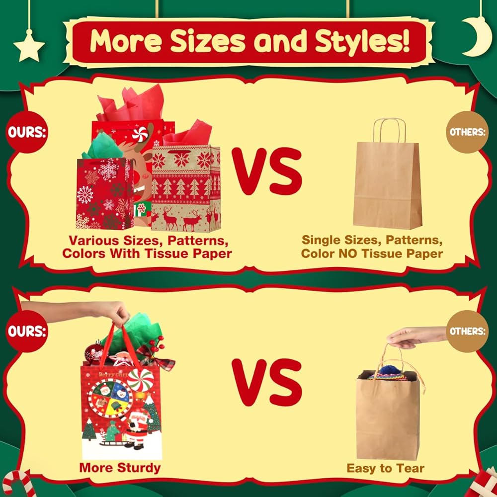 🎀Assorted Sizes Christmas Gift Bags Bulk: Christmas gift bags contains 3 sizes, 8 of Large(13x10.5x5.27inch), 8 of Medium (9x7x3.75inch) and 8 of Small(7x4.72x2.5inch). Suitable for different sizes of Christmas gifts, such as candy, jewelry, toys, clothing, etc. Your all in one Christmas gift wrapping solution.