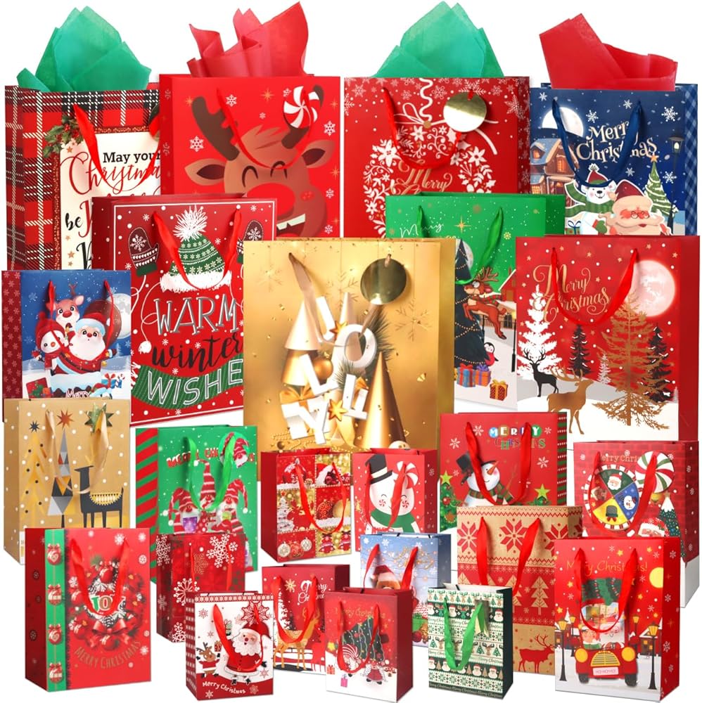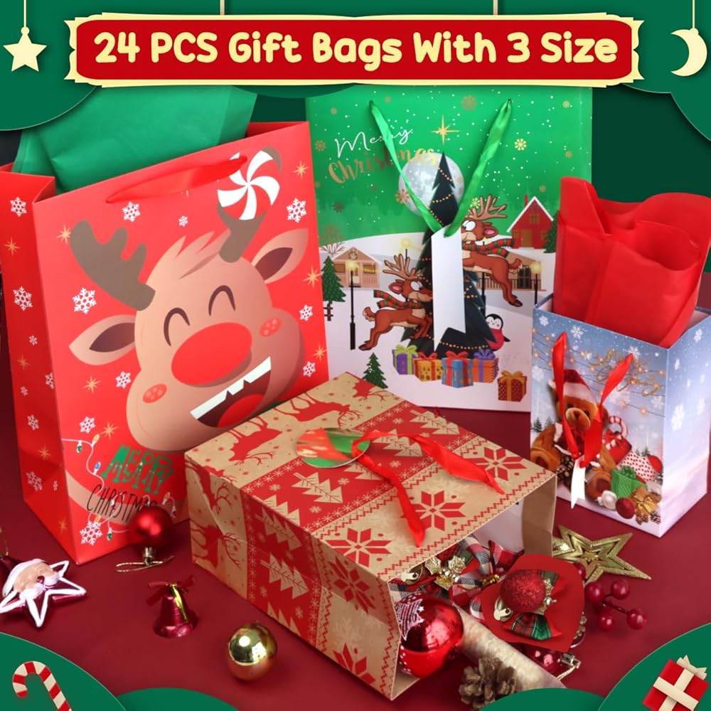 RMJOY Christmas Gift Bags Bulk: 24 Pcs Christmas Gift Wrap Bags With Large Medium Small 3 Sizes Kit Set Holiday Gift Bags With Christmas Tissue Paper and Tag Christmas Goodie Bags Party Supplies