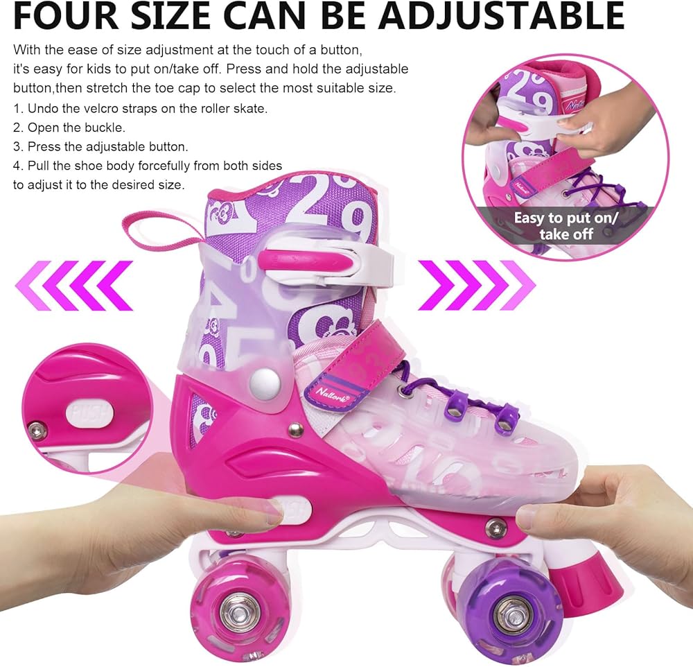 ⛸Adjustable Size for Growing Feet - We offer roller skates in four sizes: S, M, and L. Each size has four adjustable gears, ensuring a perfect fit as your child's feet grow. The adjustable sizing feature ensures comfort and a secure fit throughout their skating journey.
