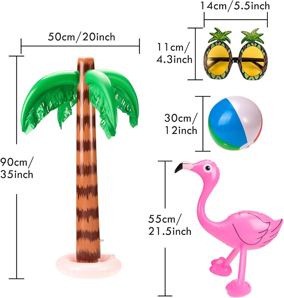 Product Size - Inflatable coconut tree: 20 x 35 inch/ 50 x 90 cm; flamingo: 22 inch/ 55 cm; beach ball: 12 inch; pineapple sunglasses: 4 x 5.5 inch/ 11 x 14 cm.