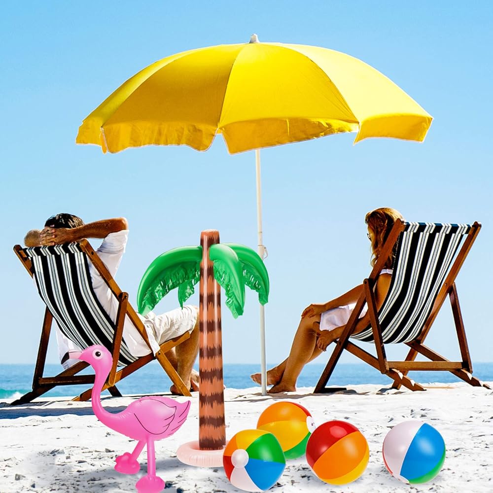 A variety of beach/pool party decorations - A full set of pool party decorations including: 2 inflatable palm trees,4 beach balls, 1 flamingos, 2 pineapple sunglasses.