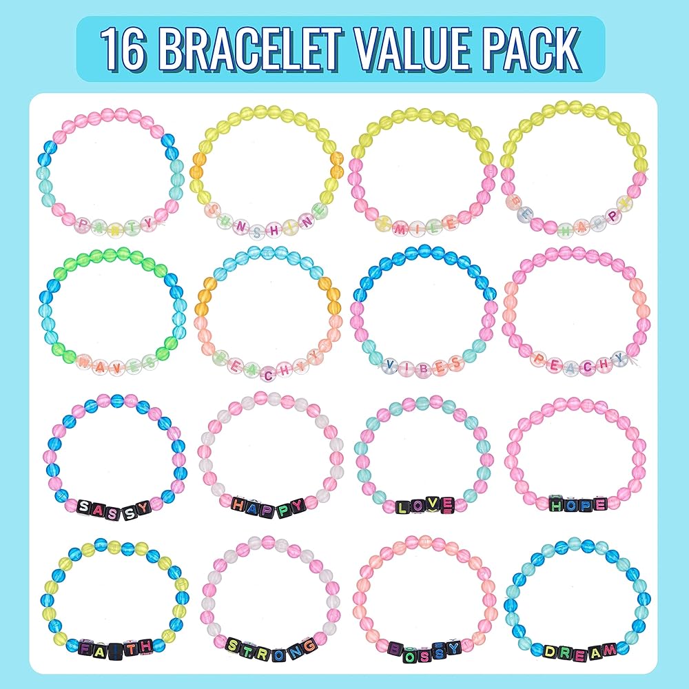 Expressions' 16PK Tear & Share Bracelets are great party favors and little gifts for kids and teens. Each bracelet features it's own unique saying or message. The first set of bracelets includes the following beaded messages: Sassy, Happy, Love, Hope, Faith, Strong, Bossy, and Dream. The second set includes the following: Party, Sunshine, Smile, Be Happy, Waves, Beachy, Vibes, and Peachy. Share the fun with friends with the tear and share perforated packaging! Each bracelet's backing also includes a TO and FROM space to make the perfect little personalized gift!