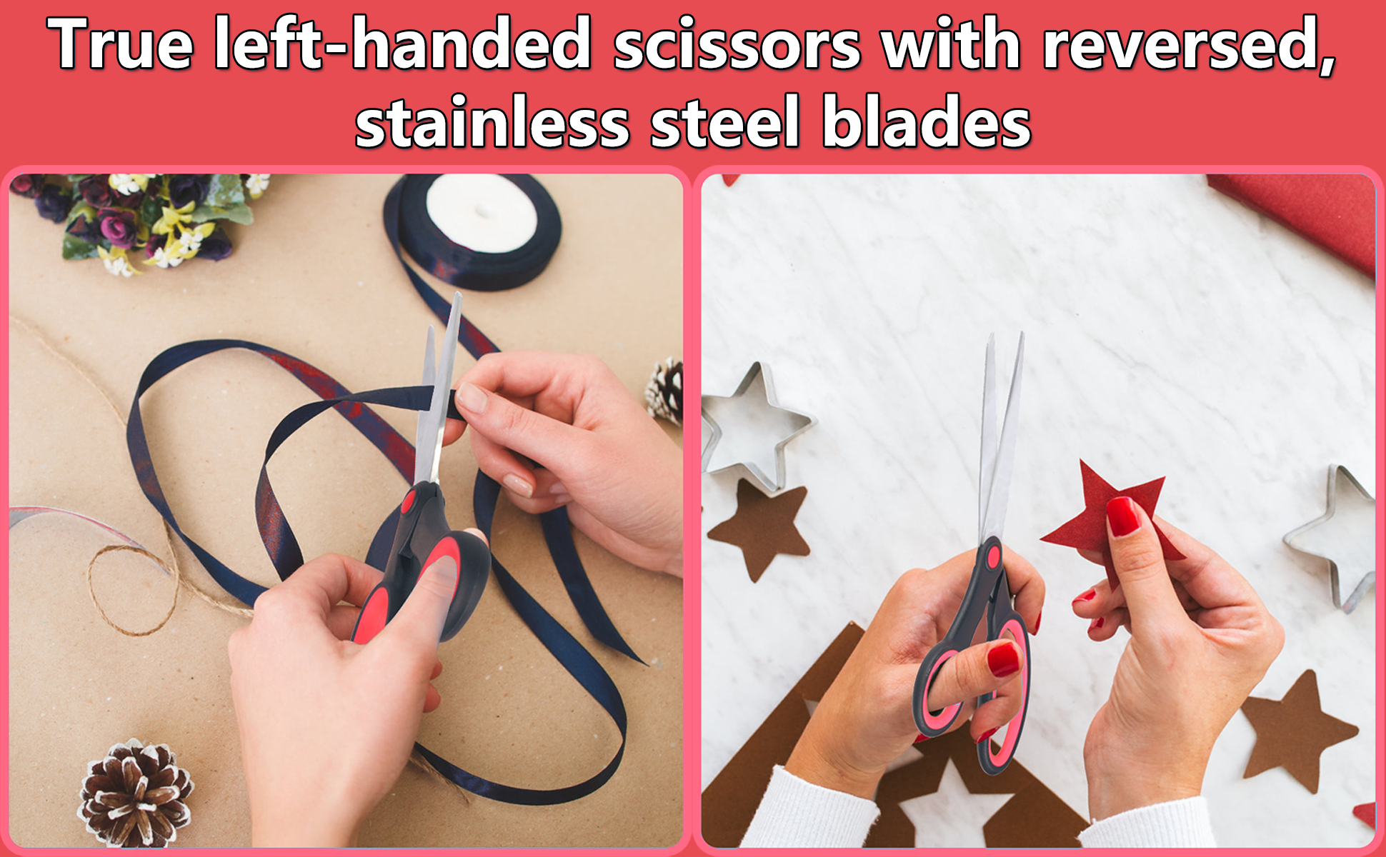 True left-handed scissors with reversed, stainless steel blades make cutting easy and effective for left-handed users