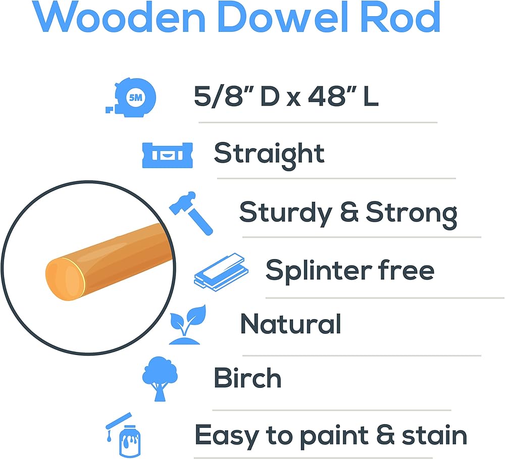 Woodpeckers Birch Wood Dowels 48 inch x 5/8 inch/Woodpeckers Birch Wood Dowels 5/8 inch x 48 inchThese pre-sanded dowels are ideal for woodworking, wood crafting, and DIY projects. We've left the wooden poles unfinished so you can paint or stain them to match any project. With the strong, straight, smooth wood sticks craft your ideas into reality!Love the product! Top quality - Made from Baltic birch, these are clean, straight, sturdy dowels with no cracks or discoloration. No prep needed - Each long dowel rod is pre-sanded and accurately sized, ready for you to work with. Eco-friendly - We support the Arbor Day Foundation to plant more trees. Paints easily - The smooth rods can be easily painted, stained, or decorated with craft embellishments.Just what you need for… Home projects (like a drying rack, shelf supports, bird perch replacement) Woodworking, STEM projects, furniture building (use as slats for a bed, wooden chair, gate, pet cage, or staircase) Crafting, macramé/wall weaving (for a very heavy tapestry, use a dowel with a thicker diameter) Flag/banner/sign stick (for a very heavy flag, use a dowel with a thicker diameter) Security bar - cut this wood rod so it fits in the track of your sliding door for added protection. Plant Support (the wooden tones of this dowel will look great in your garden!)We love to see photos and videos from our customers. Get creative, and let us know how you use 5/8-inch dowels! Looking for woodworking or craft dowels in a specific length or diameter? Check out our Woodpeckers storefront for a huge assortment of dowels in different sizes.