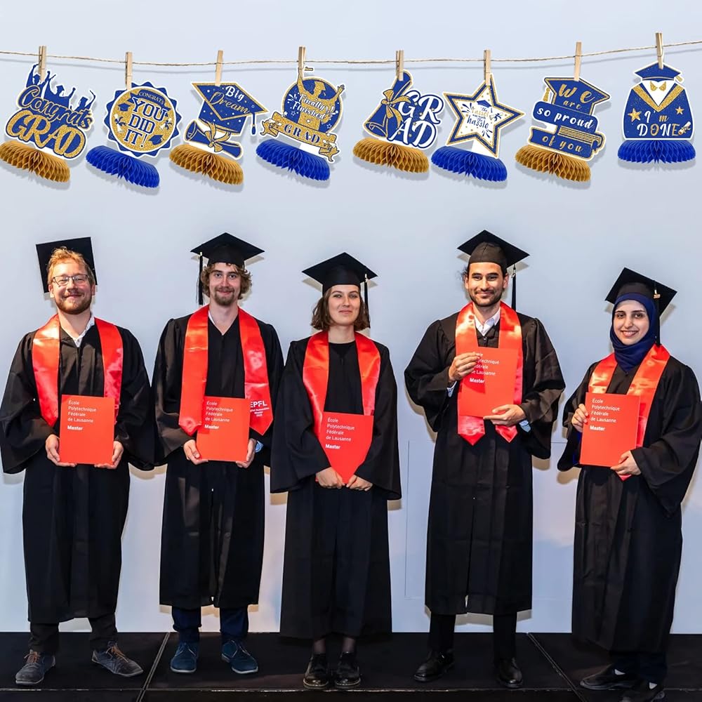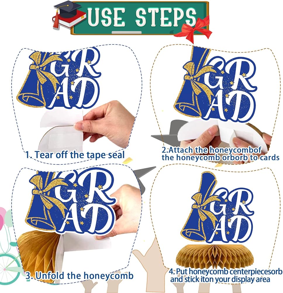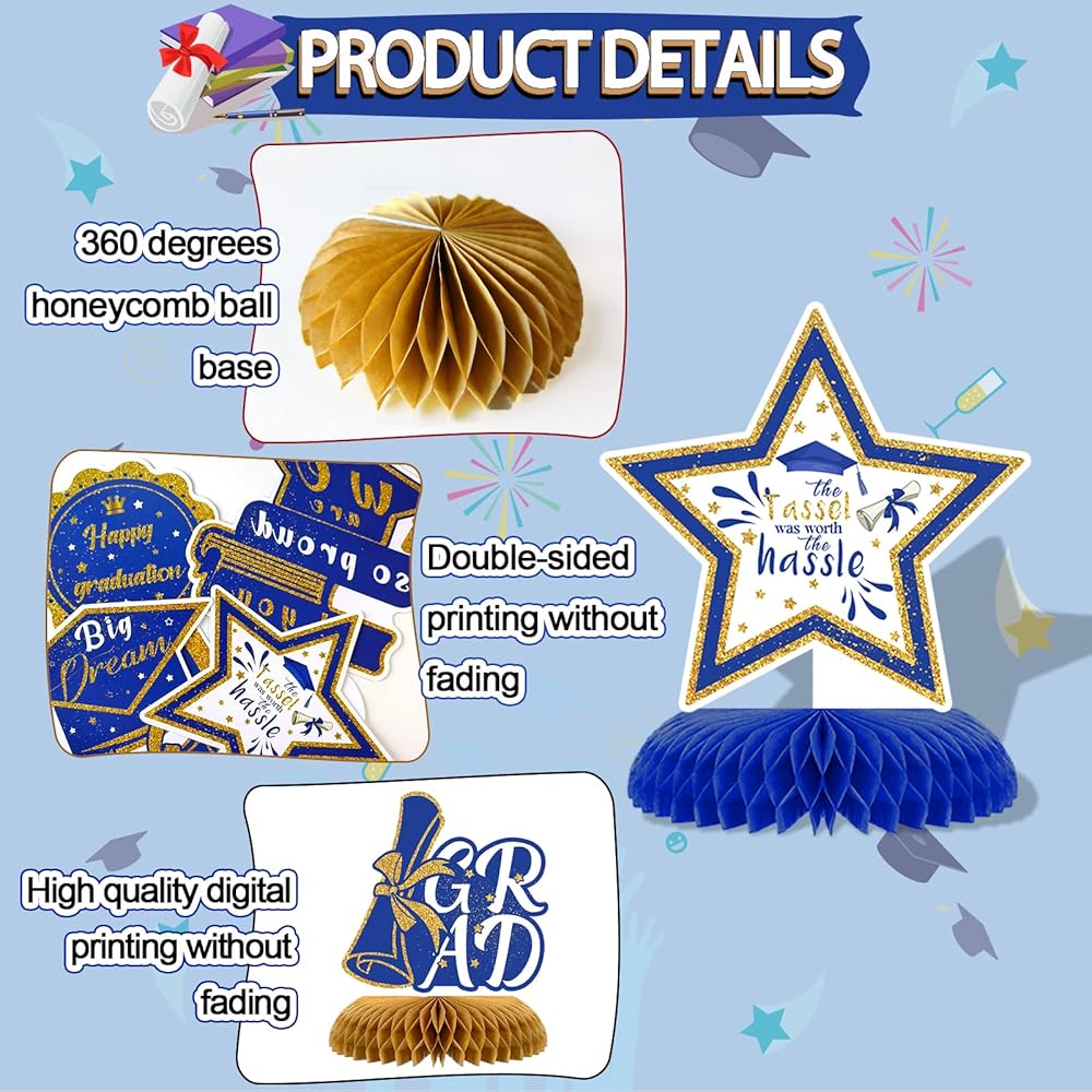 💗【Easy to assemble】The graduation honeycomb centerpieces, tear off the sticker and stick it on the card, in order to avoid falling or being blown away, better to stick the bottom at the same time, so that they can stand more firmly and can be used for party decoration with confidence.