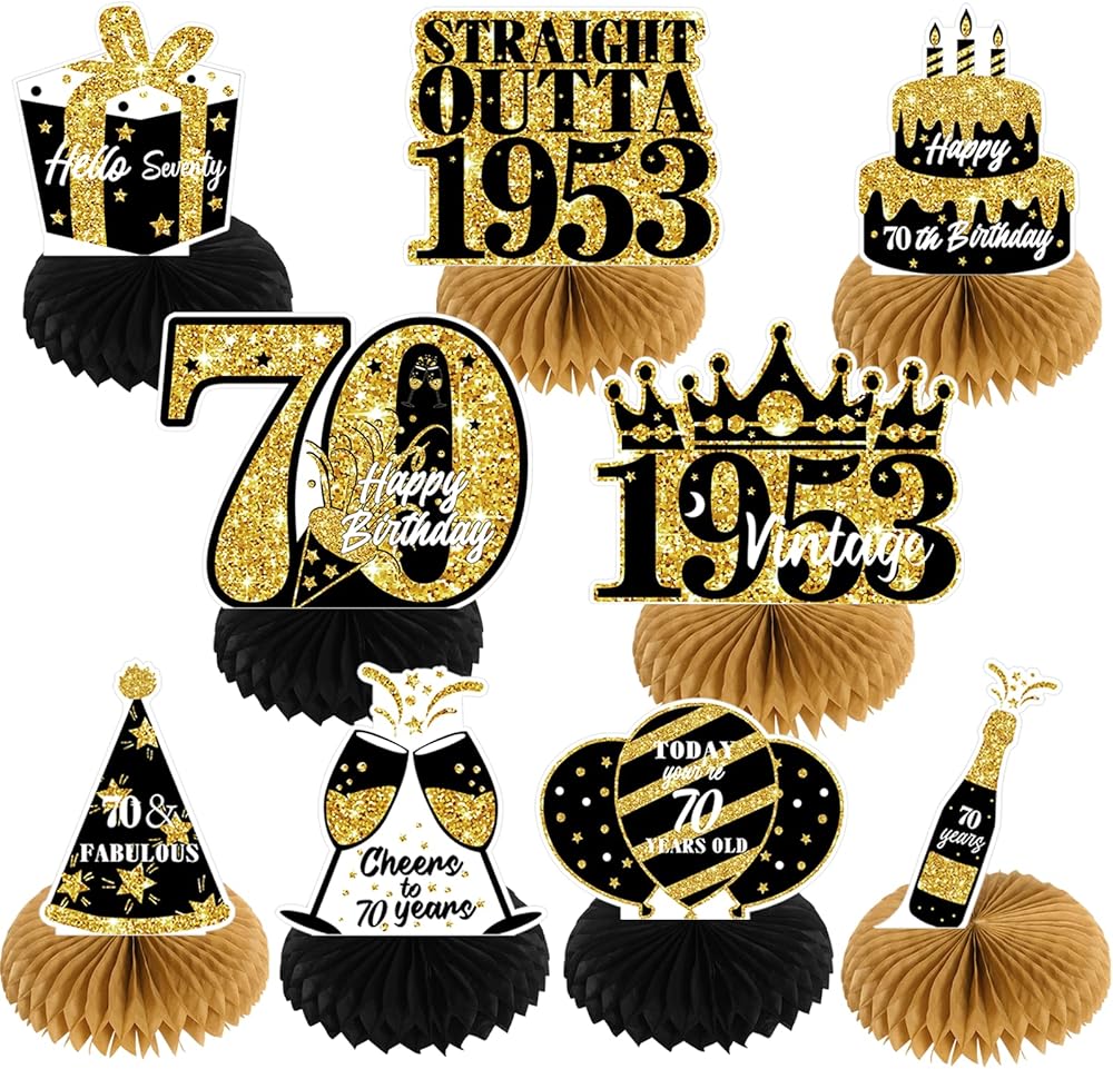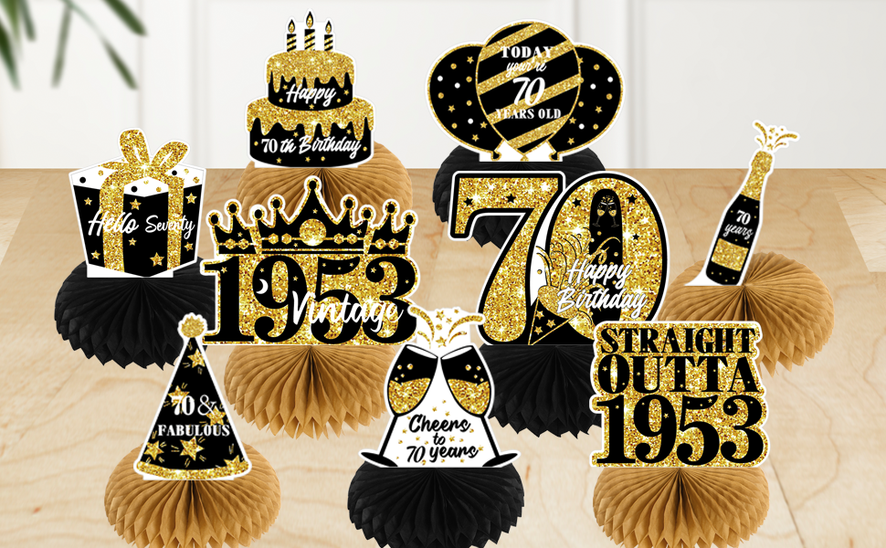 Great Value 70th Birthday Deco Set - Come with 9PCS Honeycomb Centerpieces for women men. Designed with classic elements: gifts box, champagne, goblet, cake, balloons and "1953" with crown.Special year represents a special meaning, and a unique shape reflects identity and character.