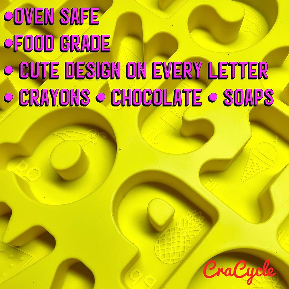 CraCycle 3D Alphabet Mold, Oven Safe, Premium Grade Silicone, Embossed Educational ABC Phonics, Crayons, Candy, Soaps (1 Yellow)