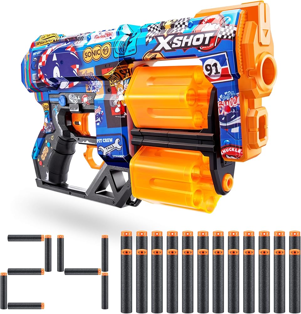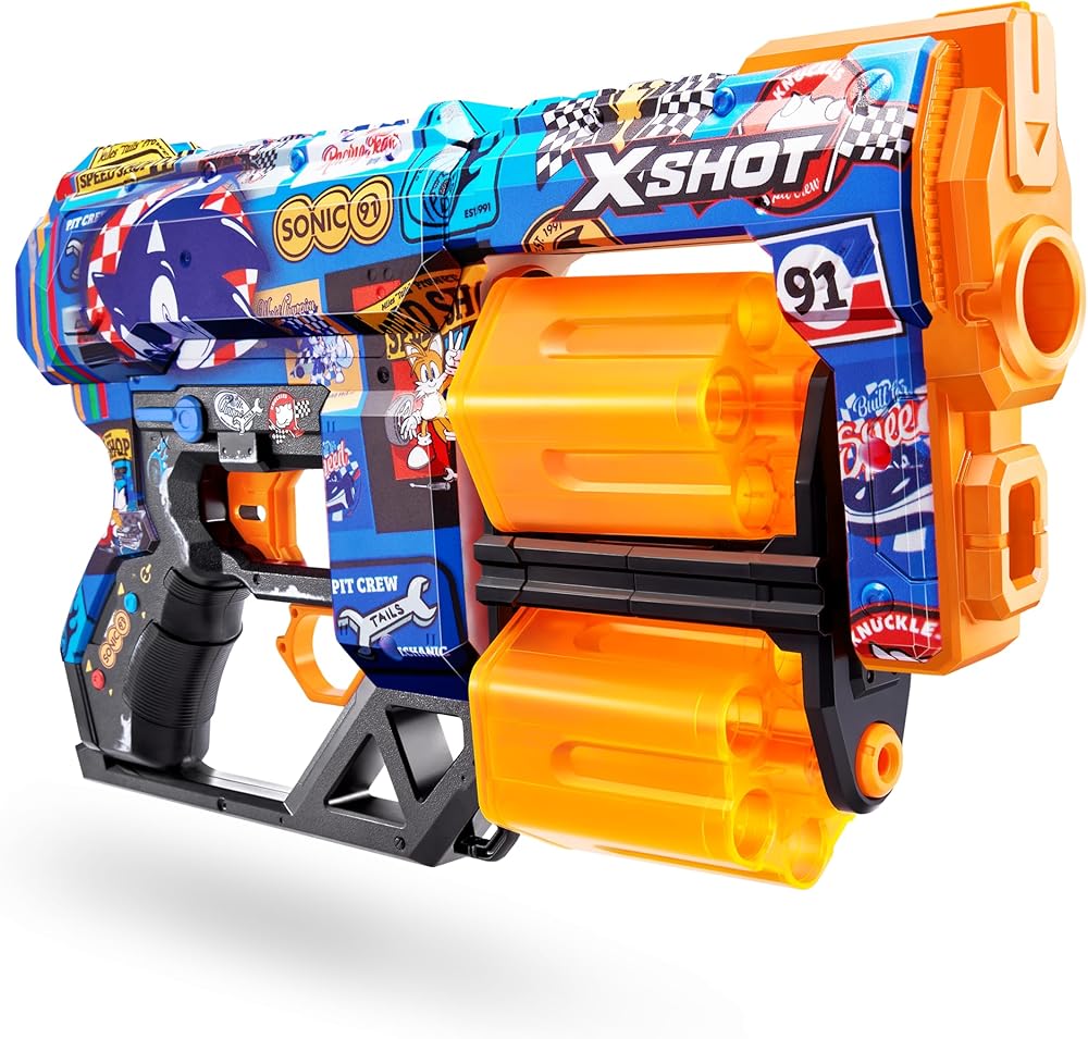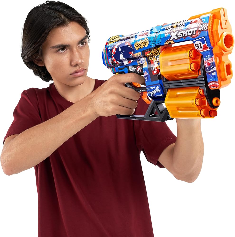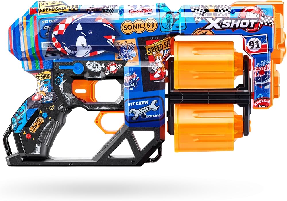 Skin your blaster with the super sonic speed of Sonic the Hedgehog! With a 12-dart capacity, the X-Shot Skins Dread's double trouble rotating barrels mean you are locked and loaded for fun. When you run out of darts in one barrel, switch over to the second one and blast the competition from up to 27m / 90 feet away. Hunt for all 6 Sonic the Hedgehog Skins and find the rare blasters. Choose different, choose X-Shot Skins.