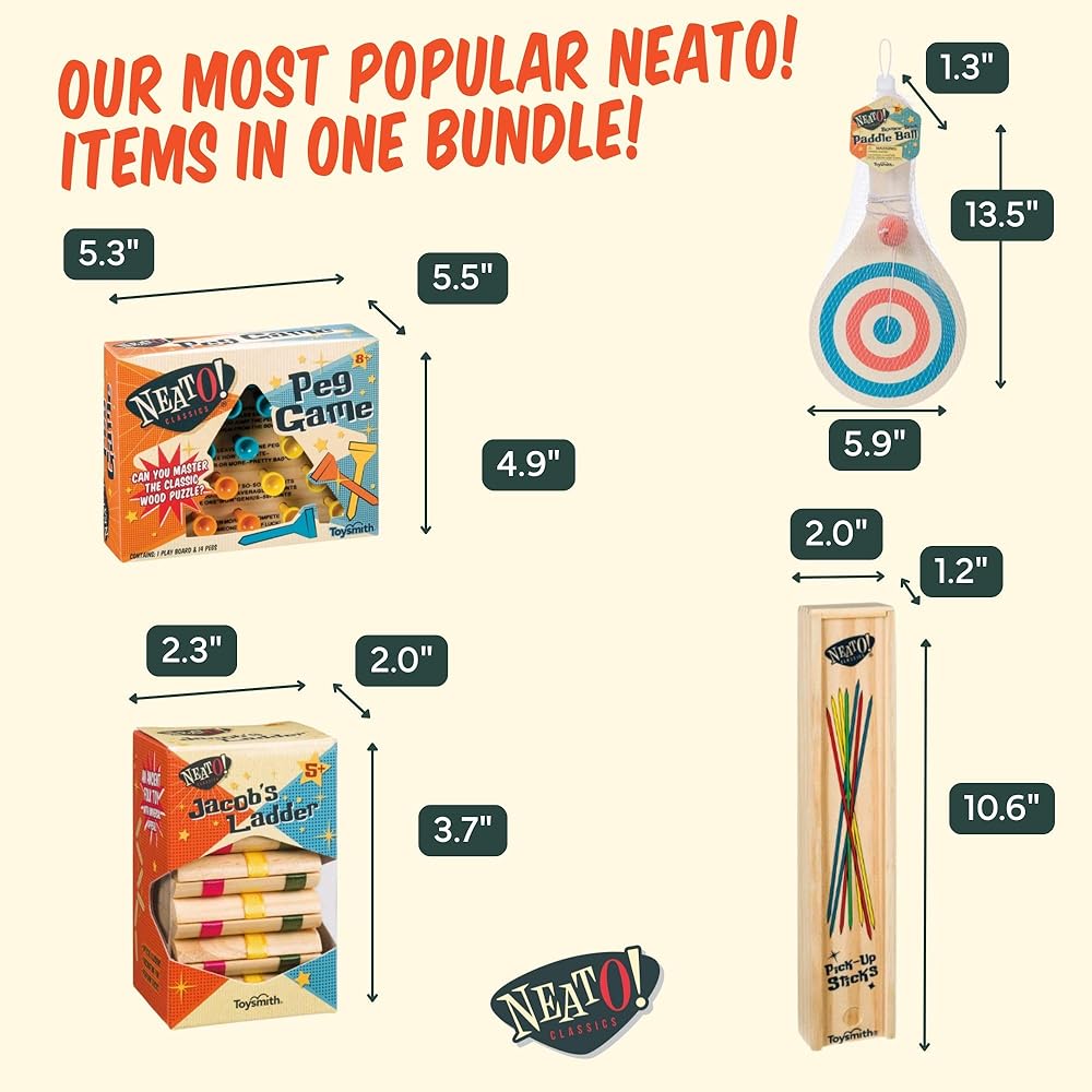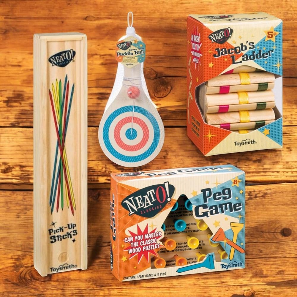 Neato Wood Toys Bundle – Includes Classic Wooden Peg Game, Jacob's Ladder Puzzle, Pick-Up Sticks, and Bounce-Back Paddle Ball – Fun Retro Games for Kids & Adults – Perfect for Travel & Family Play