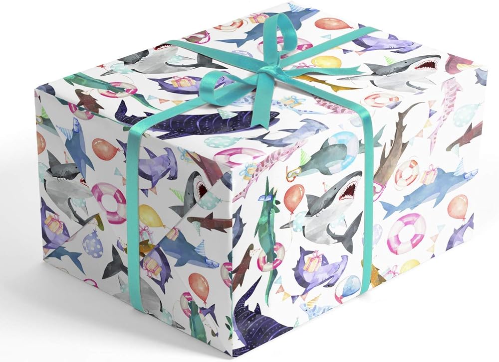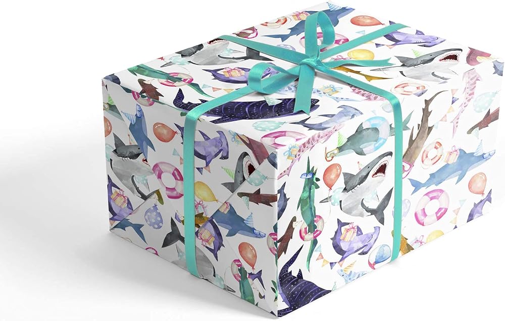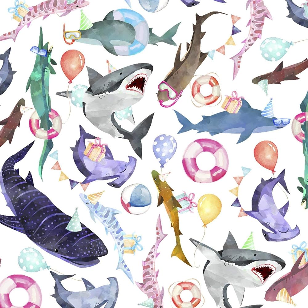 SWIM WITH SHARKS: Experience a variety of sharks up close and personal without getting bitten! Great white sharks, hammerhead sharks and a variety of other shark species don't look so scary when they are wearing party hats and sunglasses and carrying balloons and gifts! The wrap is perfect for children's birthdays, but the mature color palette and watercolor paintings make this paper equally well suited for adults.
