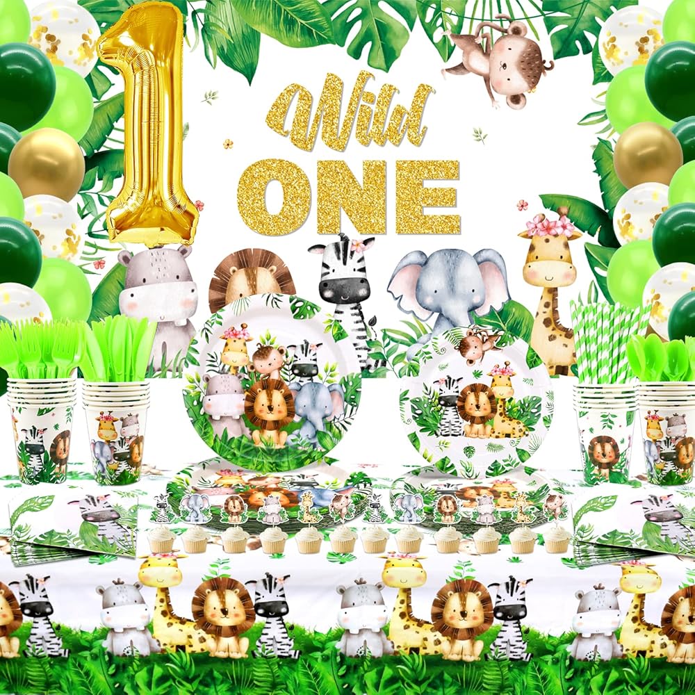 Wild One Birthday Decorations Supplies - Safari Jungle First Birthday Decorations - Plates, Napkins, Tablecloths, Straws, Cups, Cutlery, Cake Topper, Balloons, Animal Backdrop for 1st - Serves 20