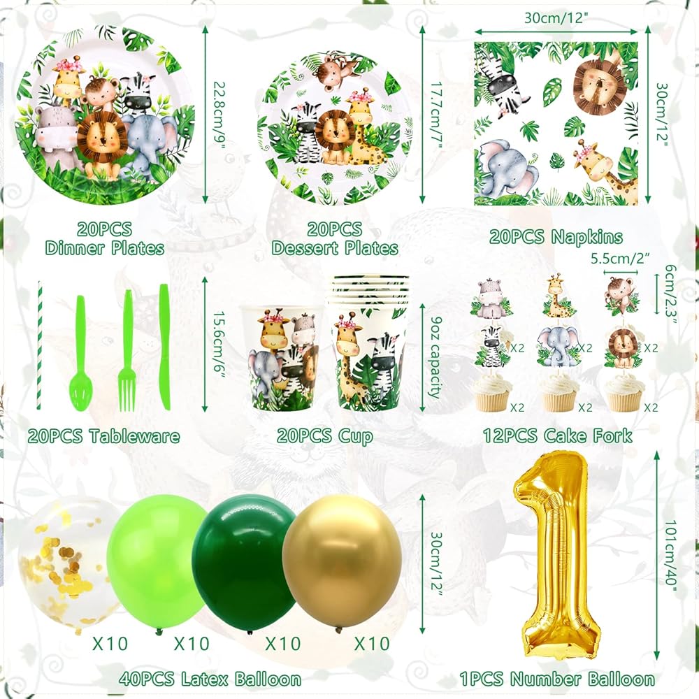 💕Wild One Birthday Tableware Set: 20pcs 9'' safari animal plates, 20pcs 7'' plates, 20pcs cups, 20pcs green forks, spoons, spoon, 20pcs wild anmal napkins, 1pcs 5.9ft * 3.9ft(180cm*120cm) safari animal wild one backdrop, 1pcs safari animal green tablecloth, 12pcs cake topper, 40pcs balloons, 1pcs number ''1'' foil balloon, The Jungle Safari 1st Birthday Party Supplies comes with 2 set balloon ribbons and 40 pcs glue points.