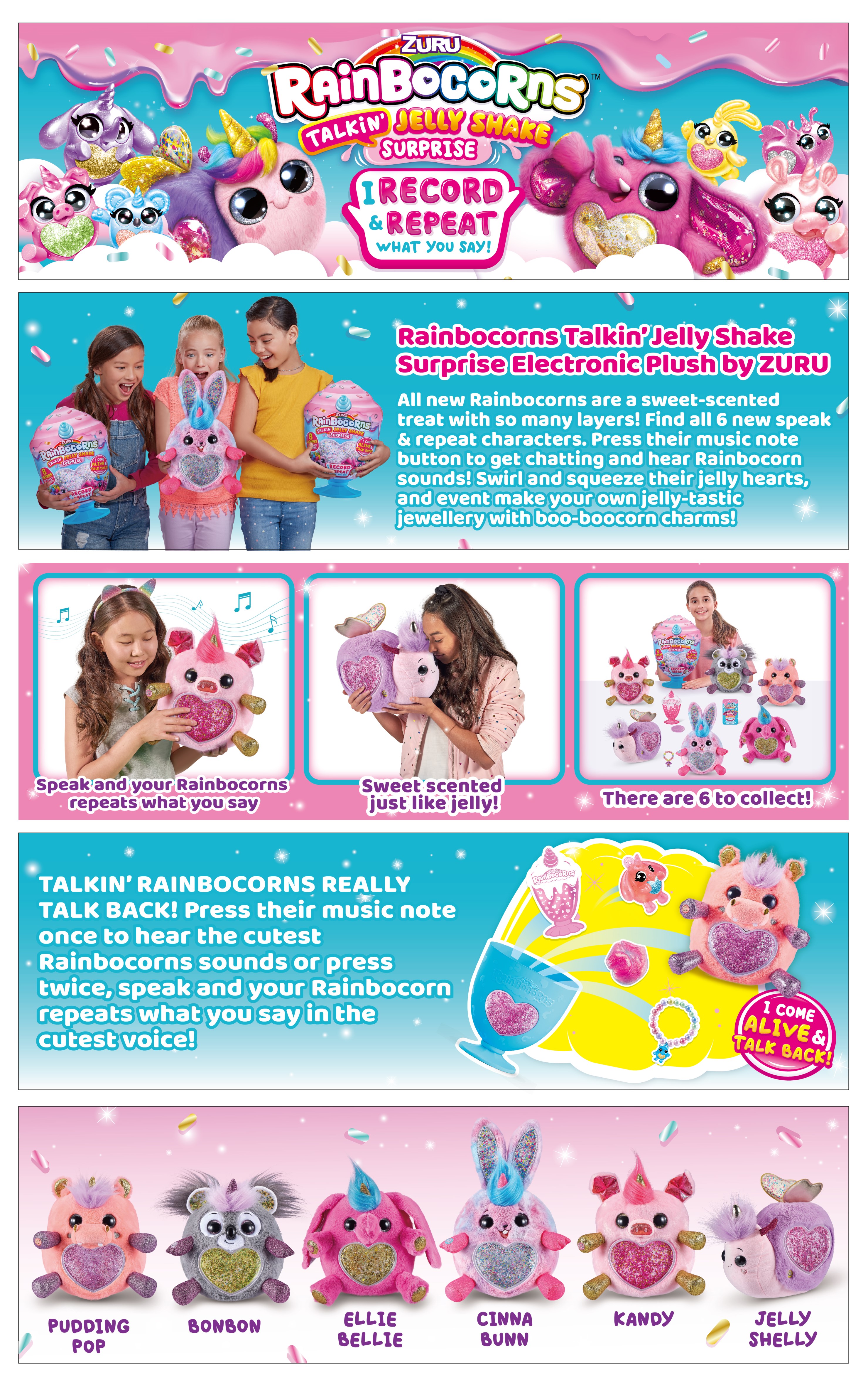 All new Rainbocorns Talkin' Jelly Shake are full of so many sweet surprises! Find all 6 new sweet-scented characters including BonBon the Koalacorn and Pudding Pop the Hippocorn. Press their paw once to hear them giggle, press twice and they will repeat what you say! Swirl, squeeze, and spread their jelly hearts, and even make your own jelly-tastic jewelery with Boo-Boocorn charms and beads! Which sweet-scented Talkin' Jelly Shake Surprise will you hatch?