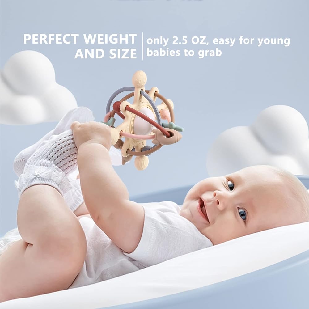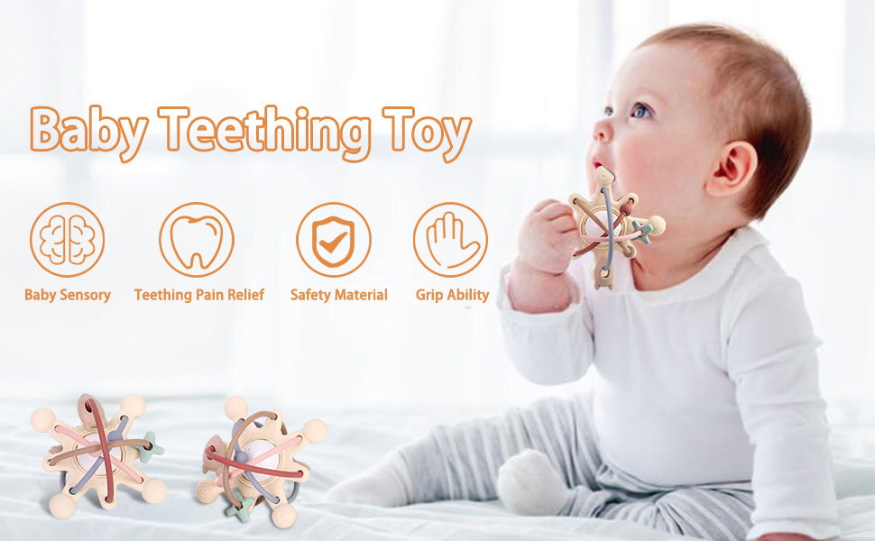 【teethers for babies 0-6 months】: This baby montessori sensory toy is designed with a lightweight of only 2.5 oz, making this baby teether easy for young babies to grab and teether on.