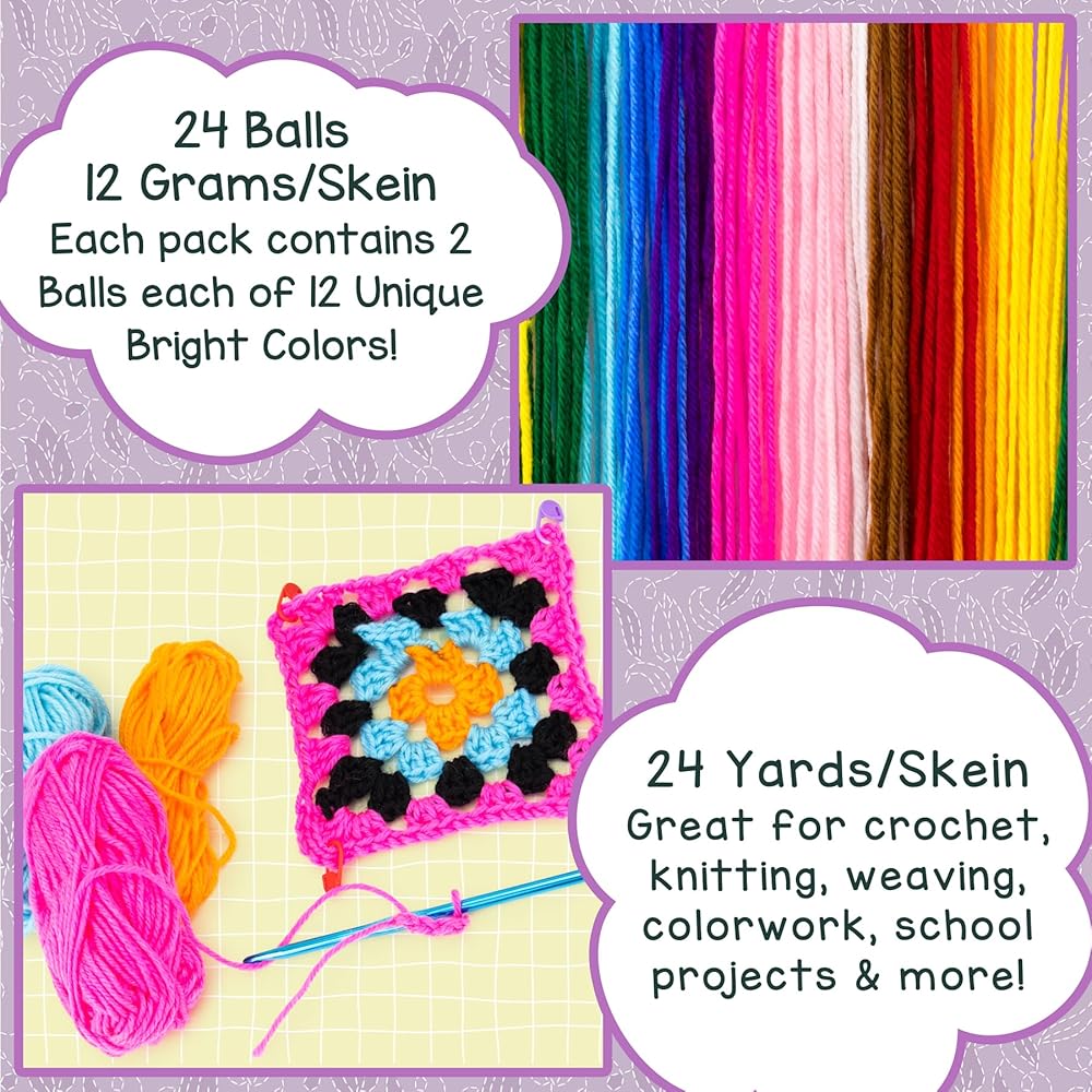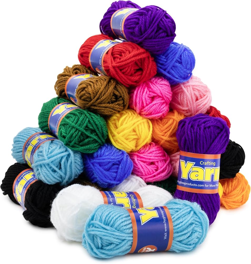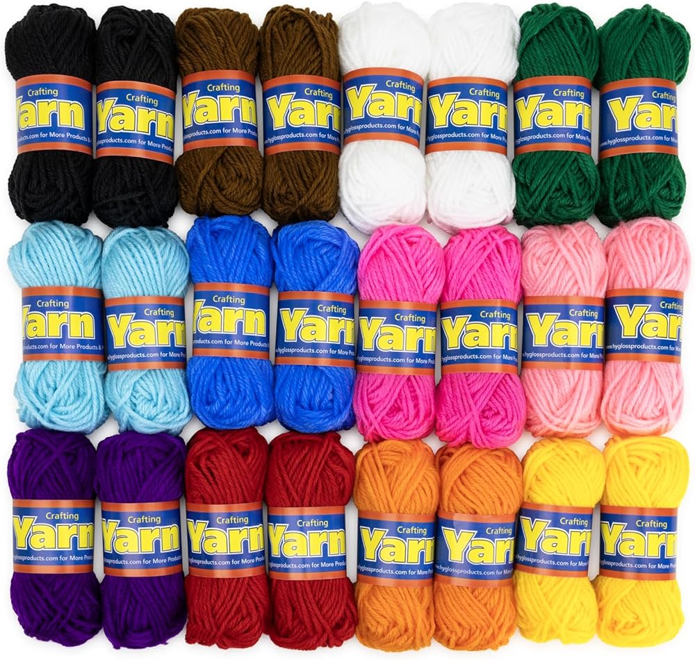 Introducing Hygloss's 100% Acrylic Yarn set, perfect for all your crochet yarn and knitting needs. This yarn set includes 24 skeins in total, with 12 vibrant colors and 2 of each color. Each ball contains approximately 24 yards of yarn, providing ample material for your crochet projects. This assortment of colors makes it the perfect yarn pack for creating colorful, eye-catching designs. The yarn is soft, making it ideal for crocheting stuffed animals or any other projects that require a soft touch. Whether you're a beginner or a seasoned pro, this yarn set is perfect for you. It's great for a variety of projects, from amigurumi crochet to worsted weight yarn projects. This yarn is also suitable for tufting, making it a versatile addition to your knitting supplies. The Hygloss 100% Acrylic Yarn set is not just for crocheting and knitting, it's also perfect for other mini crafts. The quality and variety of this yarn set make it a great choice for your next knitting or crochet project. So why wait? Add this wonderful yarn set to your cart today and start creating beautiful, colorful projects.