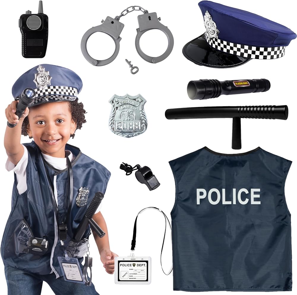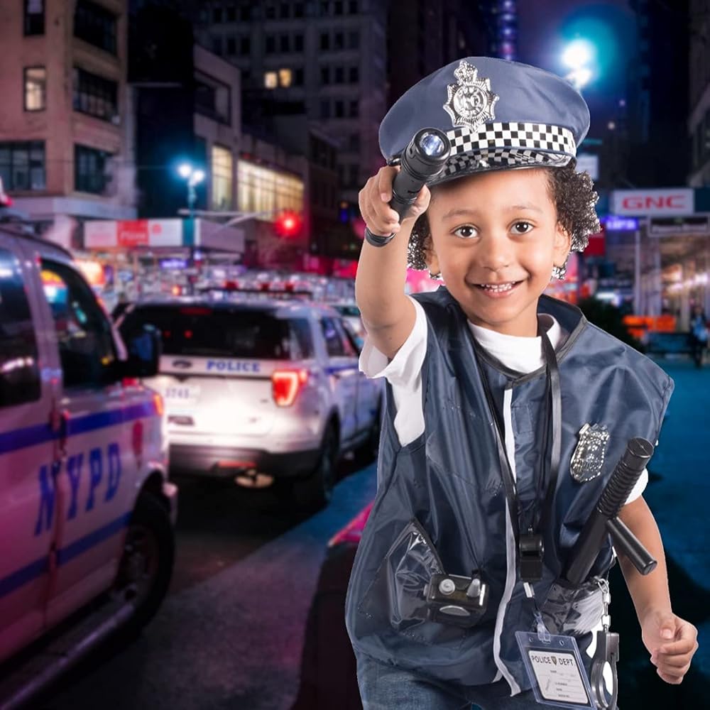 👮 IDEAL GIFT: This police outfit for kids is useful for educational games and keeps children entertained & happy! Complete with its costumes for kids set, it is perfect for police dress up for boys or police costumes for girl