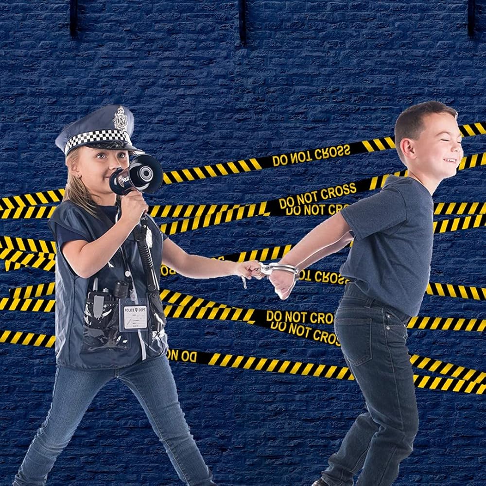 👮 EXCELLENT QUALITY: This kids police costume has 12 pieces of superb quality toys and includes police uniform for kids, cop hat, washable police vest, handcuffs for kids, police badge toy, kids toy gun, whistle, police flashlight toy with functional light & kid police walkie talkie with REAL siren sounds (with batteries included)