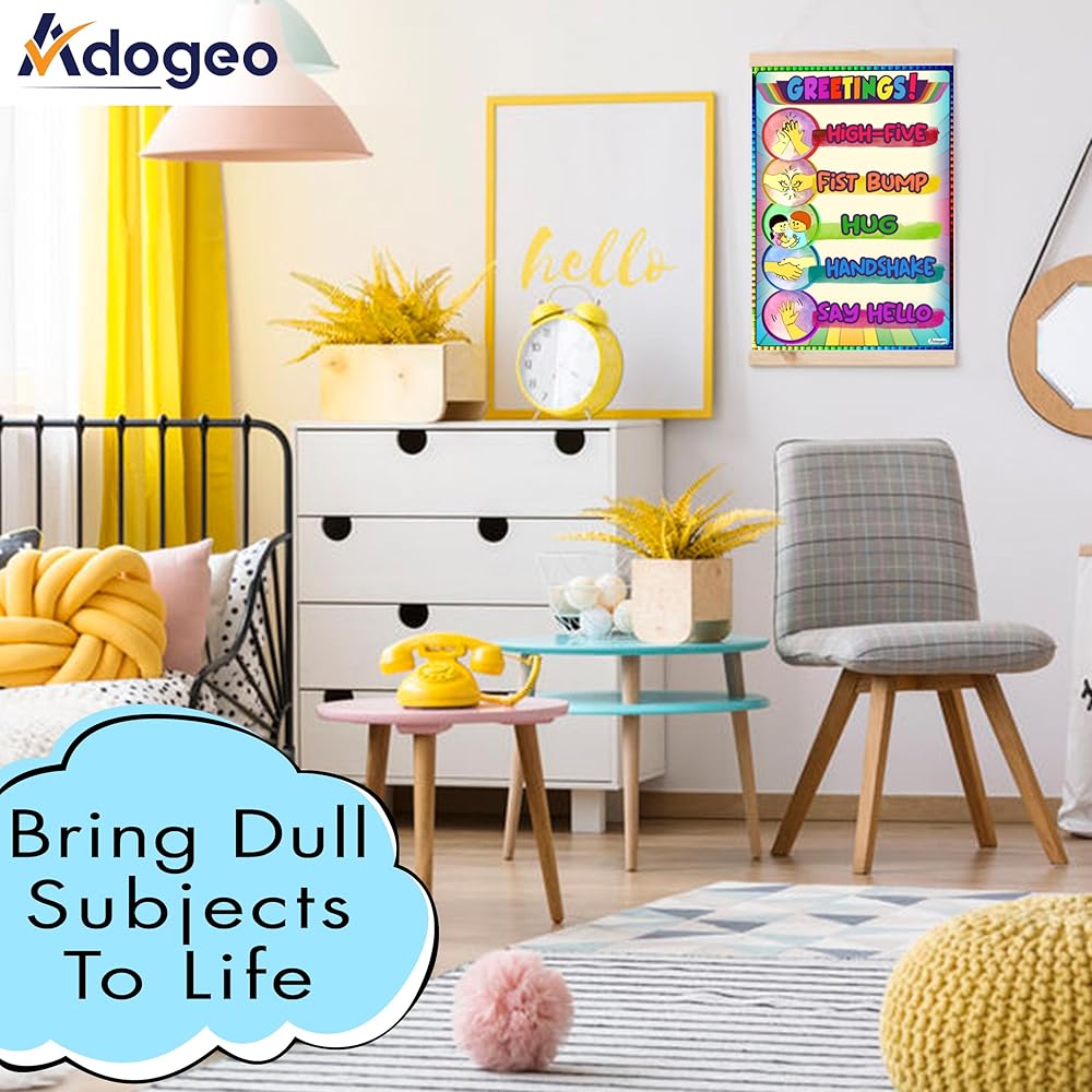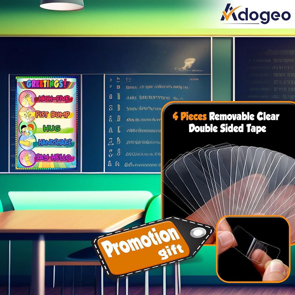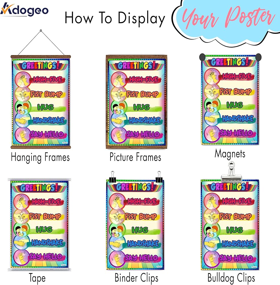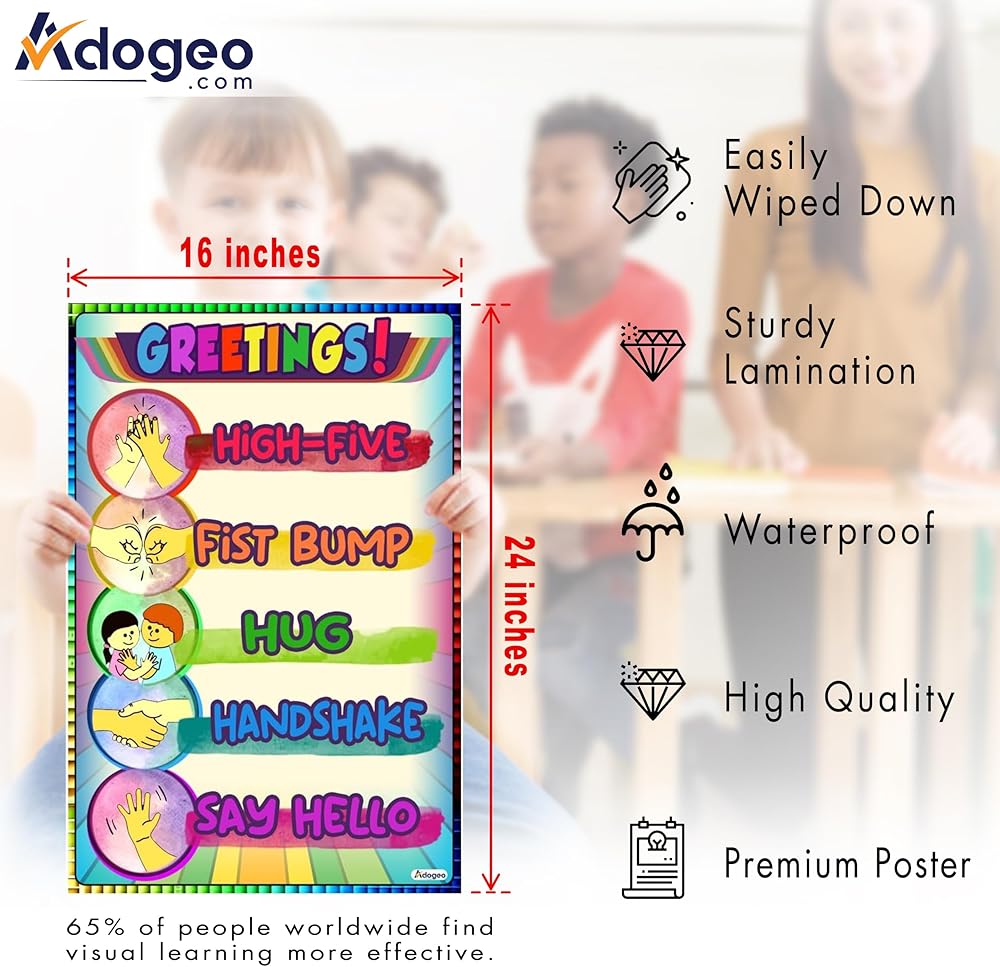 🎁[PERFECT SIZE]: The Greetings Poster for Kids by Adogeo is designed in a perfect size of 16''x24'', making it easily visible and readable for young learners in classrooms, pediatrician offices, and homeschooling settings.