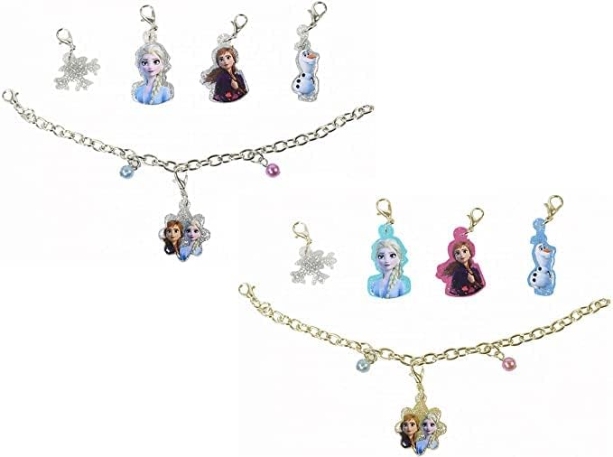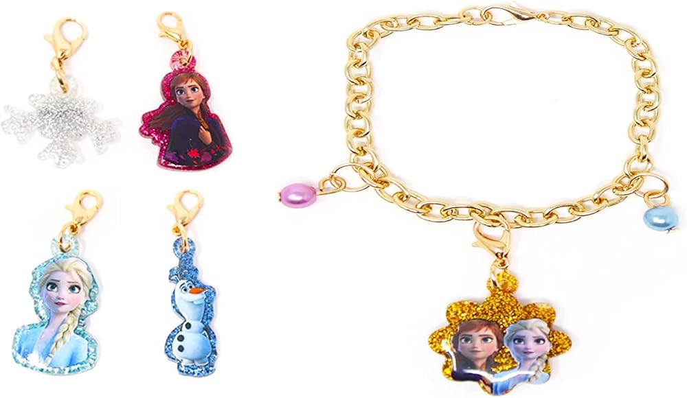 Disney Frozen Charm Bracelet for Kids - Frozen Jewelry Bundle with Charm Bracelet and 5 Charms Plus Frozen Stickers and More (Disney Accessories Girl). This Frozen dress up accessories set includes 1 charm bracelet with 5 charms featuring favorite Frozen characters including Elsa, Anna, and Olaf. Charm bracelet colors may vary. Great for all fans of Disney, this Frozen jewelry set is great to use as party favors, goodie bag fillers, part of a gift basket, costume pieces, and more. Sure to be a hit with Frozen fans of all ages, these jewelry pieces will make a great addition to any dress up parties and will elevate any outfit. Officially licensed Disney Frozen charm bracelet for kids of all ages also includes Frozen stickers and a princess castle door hanger.