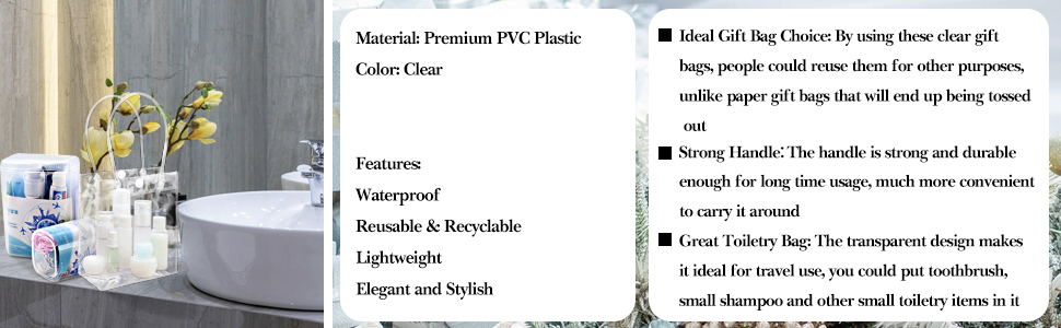 Material: Our shopping tote bags are made of PVC plastic which is lightweight, waterproof, reusable, recyclable and easy to clean. The elegant and stylish of this clear bags will let you stand out in the crowd and catch everyone's attention, you could even DIY them to add your personal style