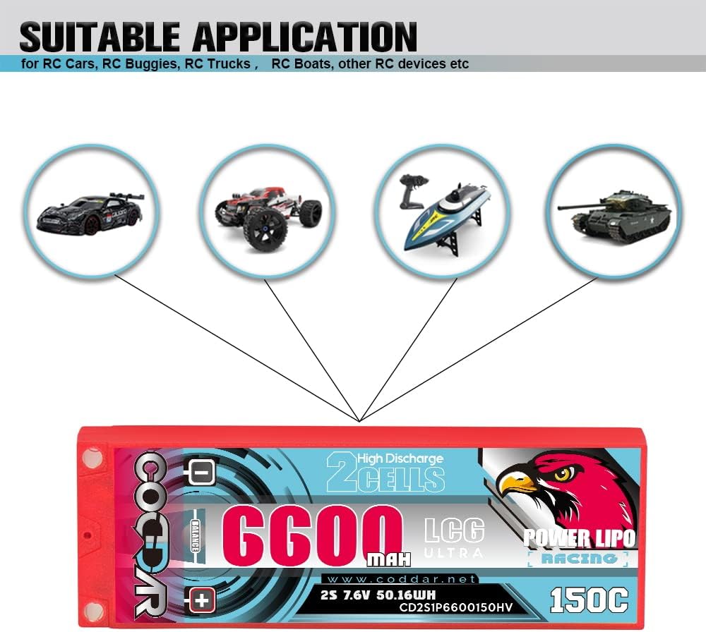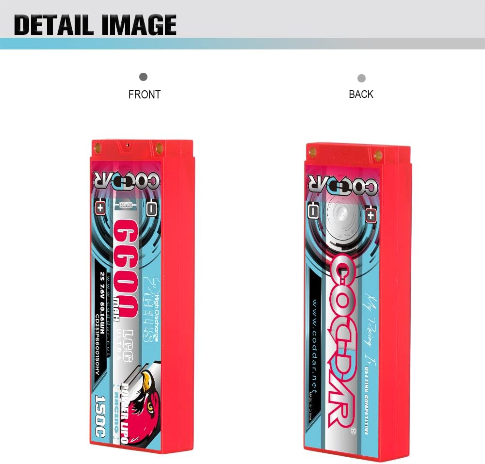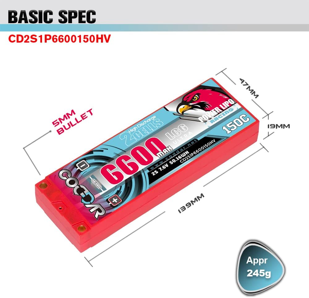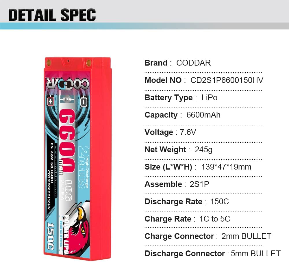 Specifications:CODDAR CODDAR 6300mAh 2S 7.6V 150C HV with Genuine Amass 5mm BULLET and XH-JST balance Connector, Dimension 139(L)*47(W)*19(H)mm, Approximately Weight 231grams