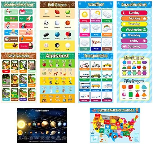 Educational Preschool Posters, Emooqi 20 Pieces(16×11in) for Toddlers and Students, Early Learning Chart for Wall, Kindergarten Learning Posters Include Alphabet, US Map, Colors,Teach Numbers and More.