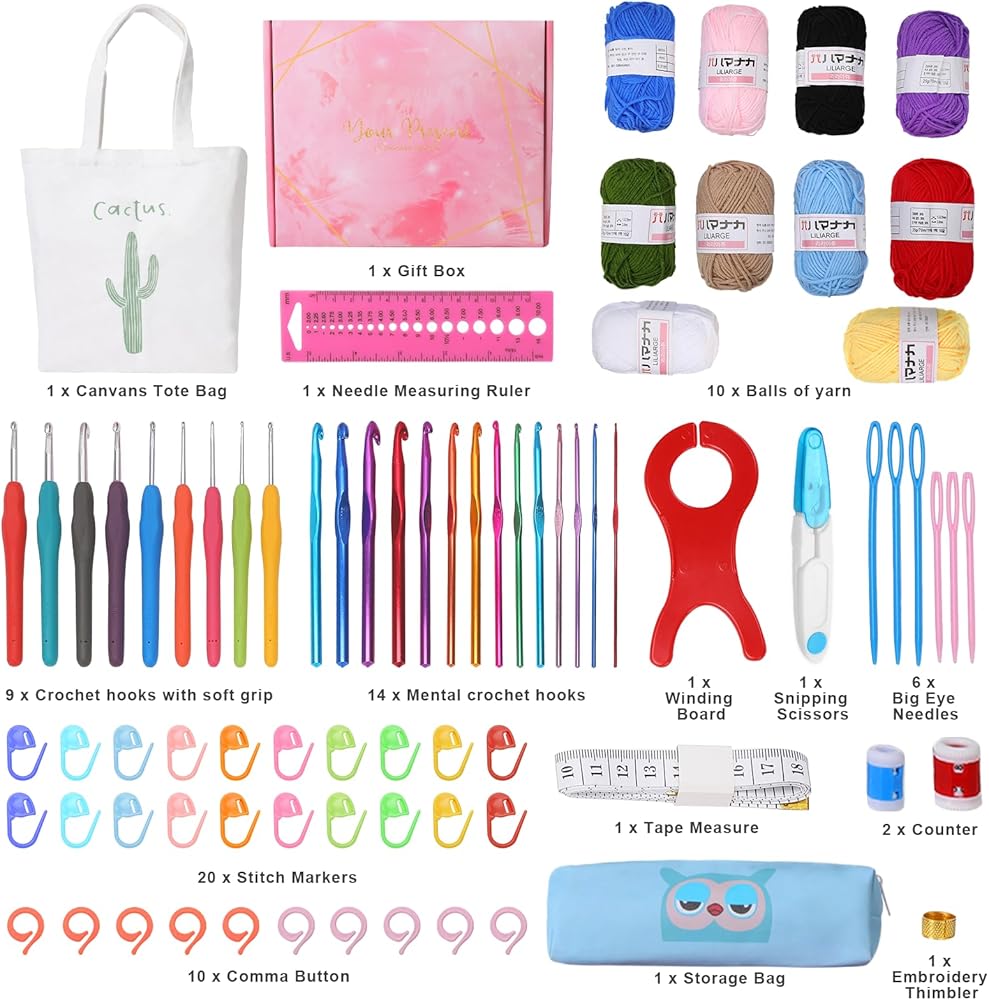 【78 Pcs Complete Crochet Kit for Beginners】The crochet starter kit for kids and adults contains everything you need to create beautiful, handmade crochet projects. Crochet set includes: 9 x soft handle crochet hooks (2.0-6.0 mm), 14 x Metal crochet hooks (2.0-10mm), 10 x yarn balls, 1 storage bag, 1 hand bag, 1 gift box, 42 bonus crochet accessories.