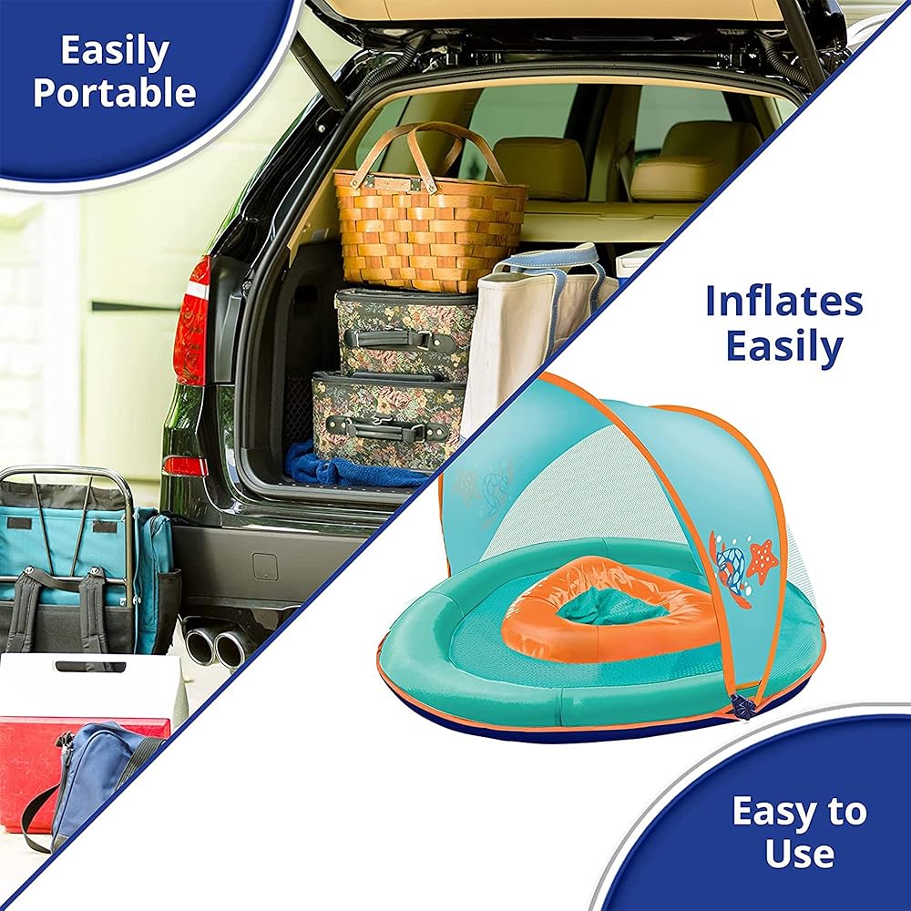 INFANT BABY POOL FLOAT: Features a multi-point adjustable safety seat, dual inflation chambers, child safety valves for security, and 20% wider for superior buoyancy/stability in the water.D