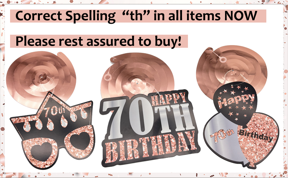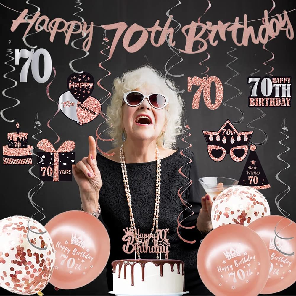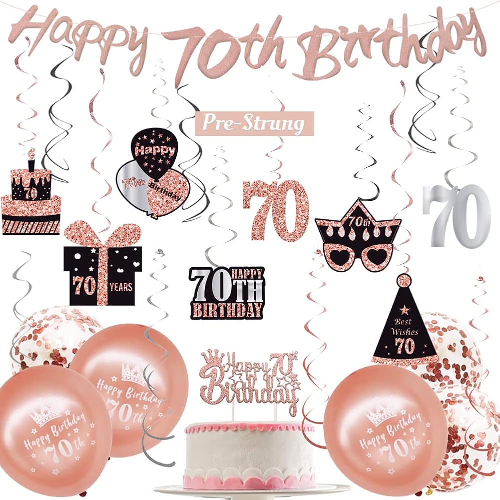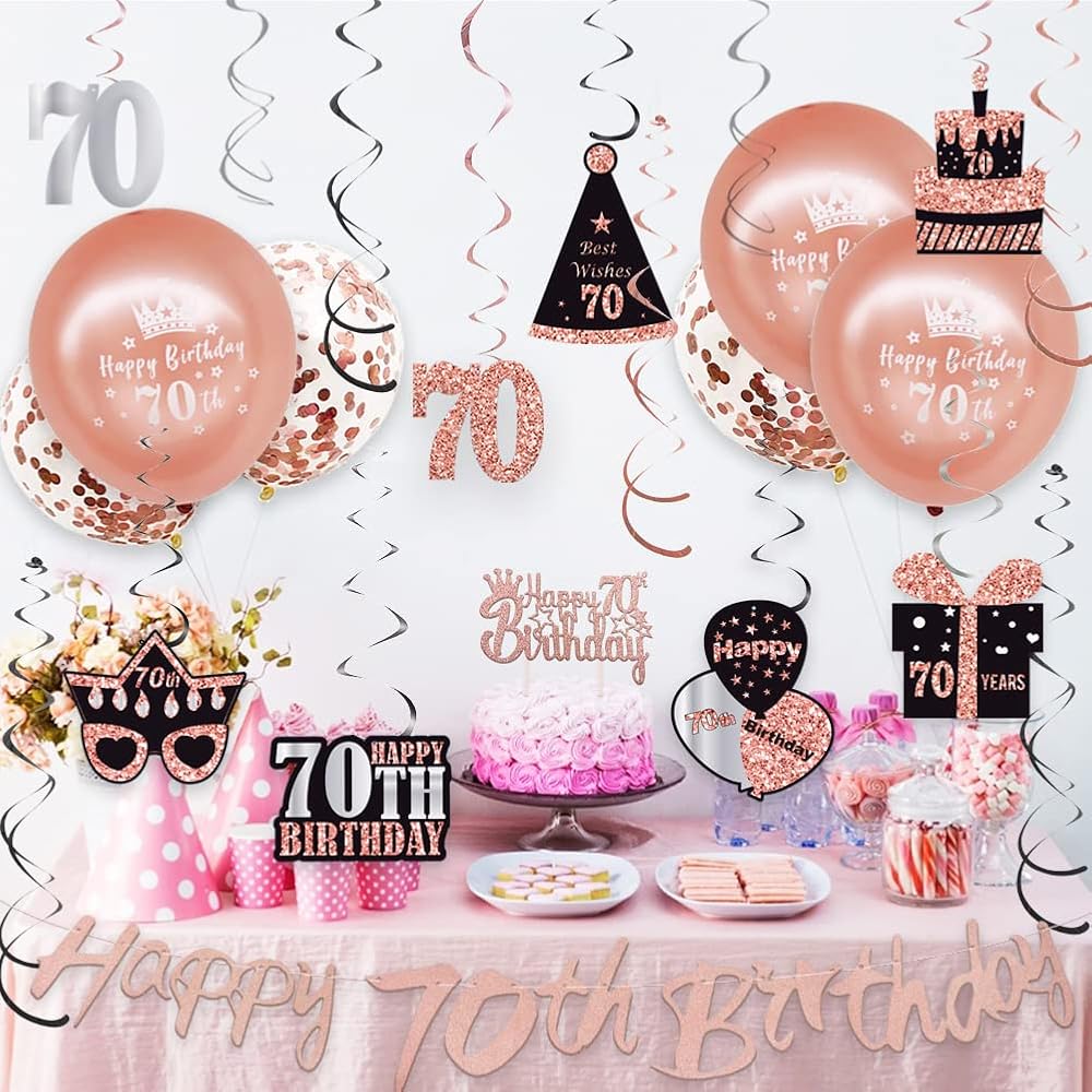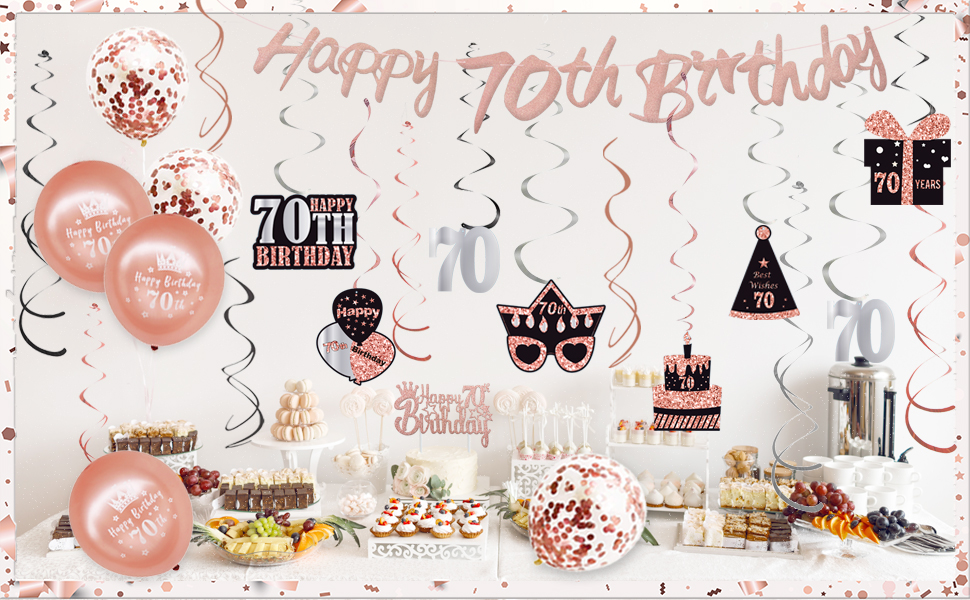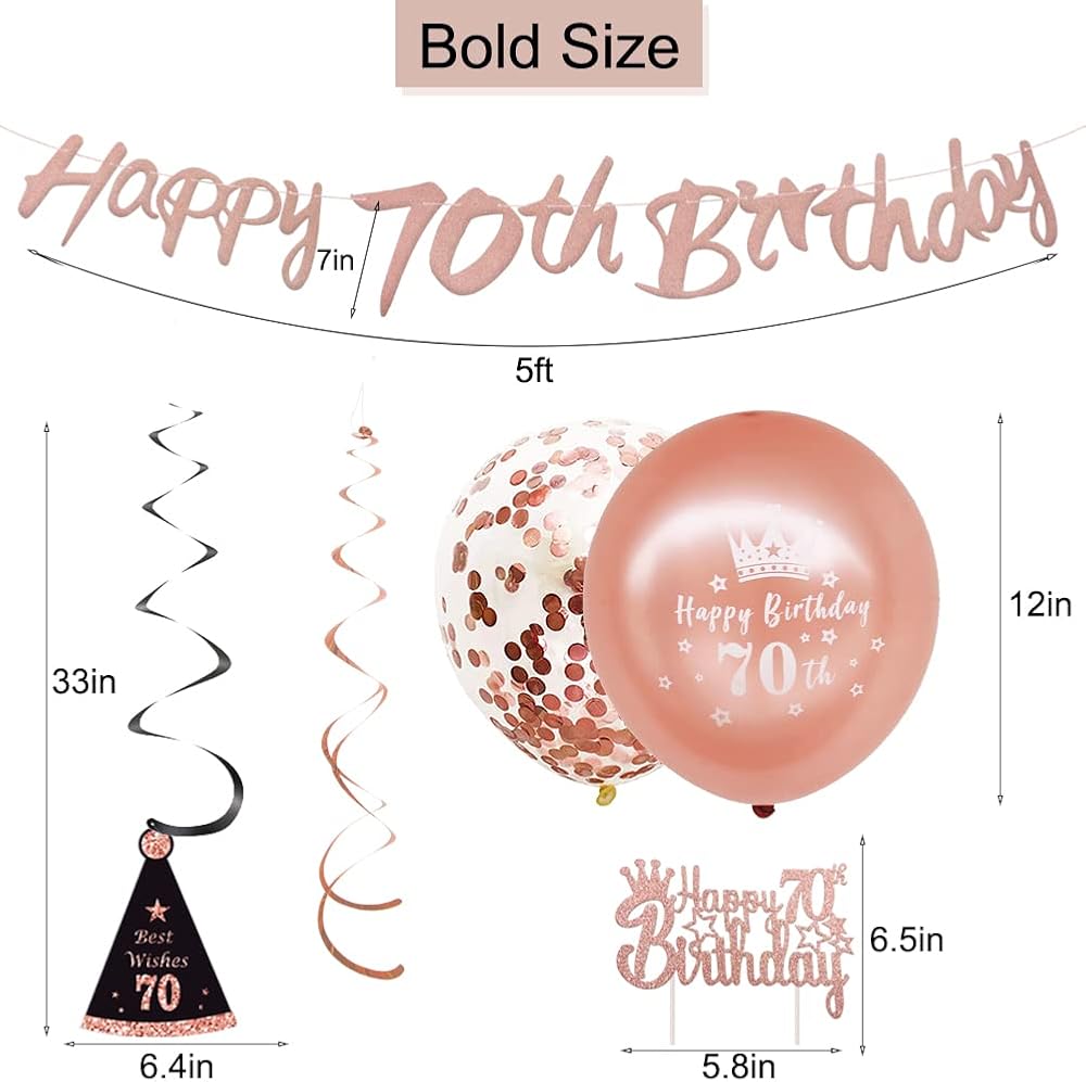 Suitable Size: Our 5ft happy 70th birthday banner and 33in swirls (when extended), 12in 70th birthday balloons are all big and noticeable; the elegant rose gold color and beautiful designs will liven up the birthday party and make the room fun and festive