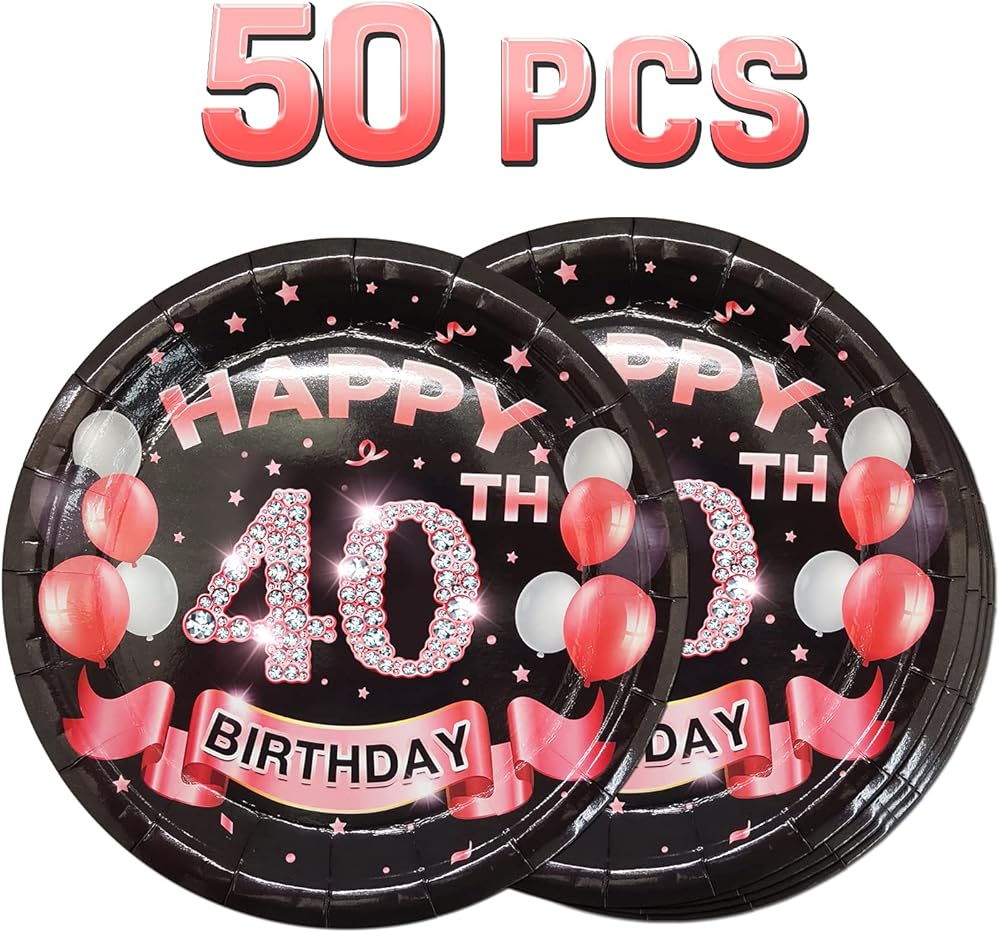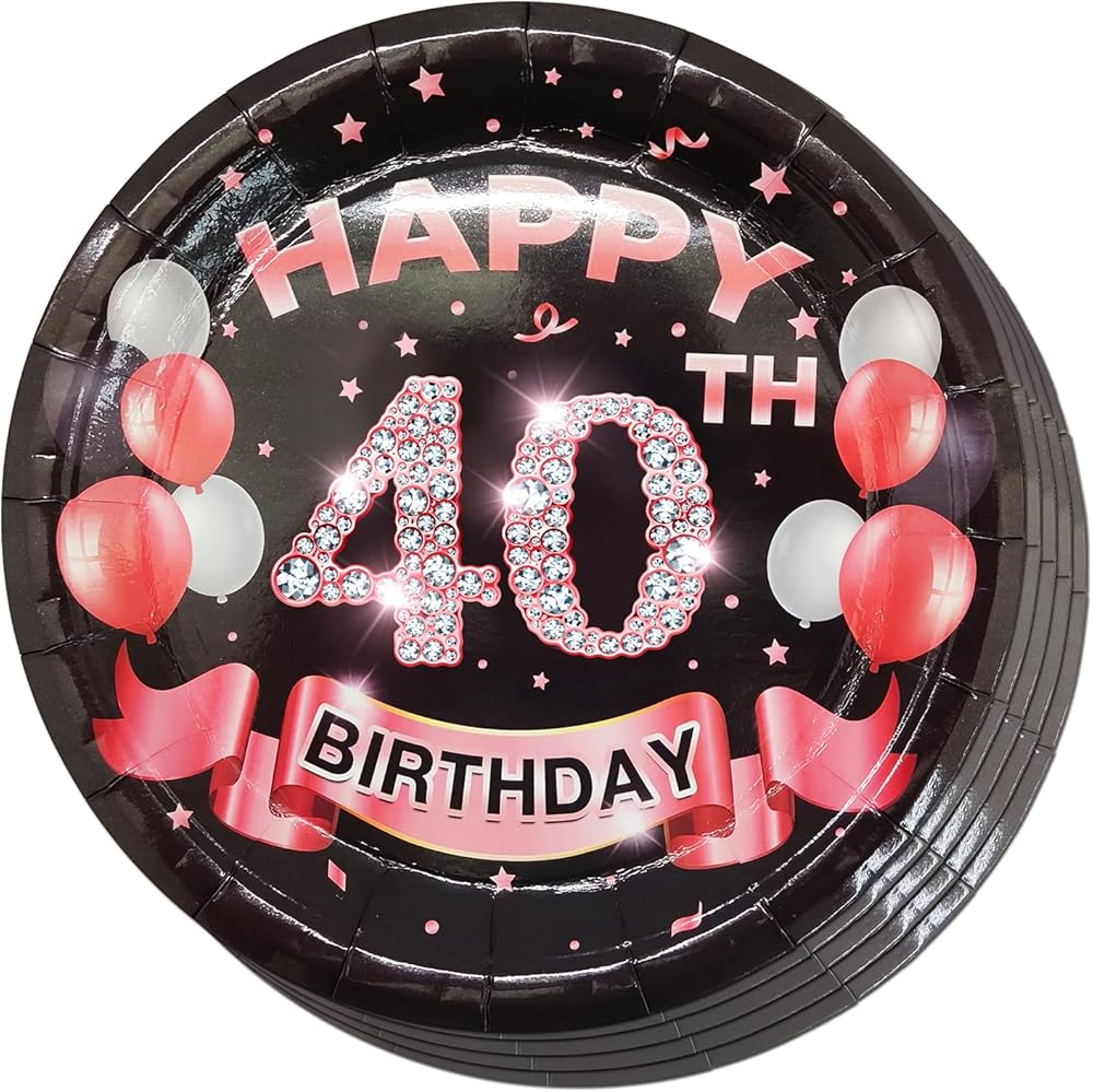 40th Birthday Plates Black and Pink Dessert, Buffet, Cake, Lunch, Dinner Plates for 40th Birthday Decorations Party Supplies, Happy 40th Birthday! 50 Count, 9" Plate Design for 40th Birthday Party