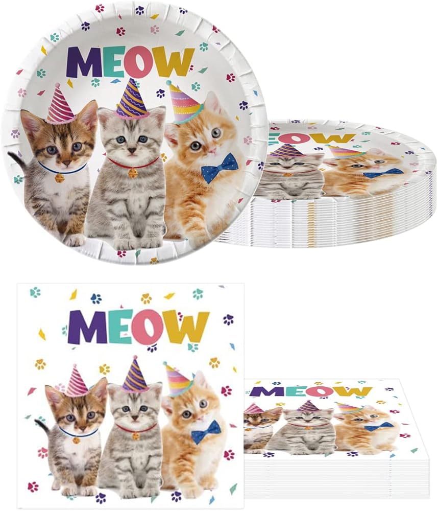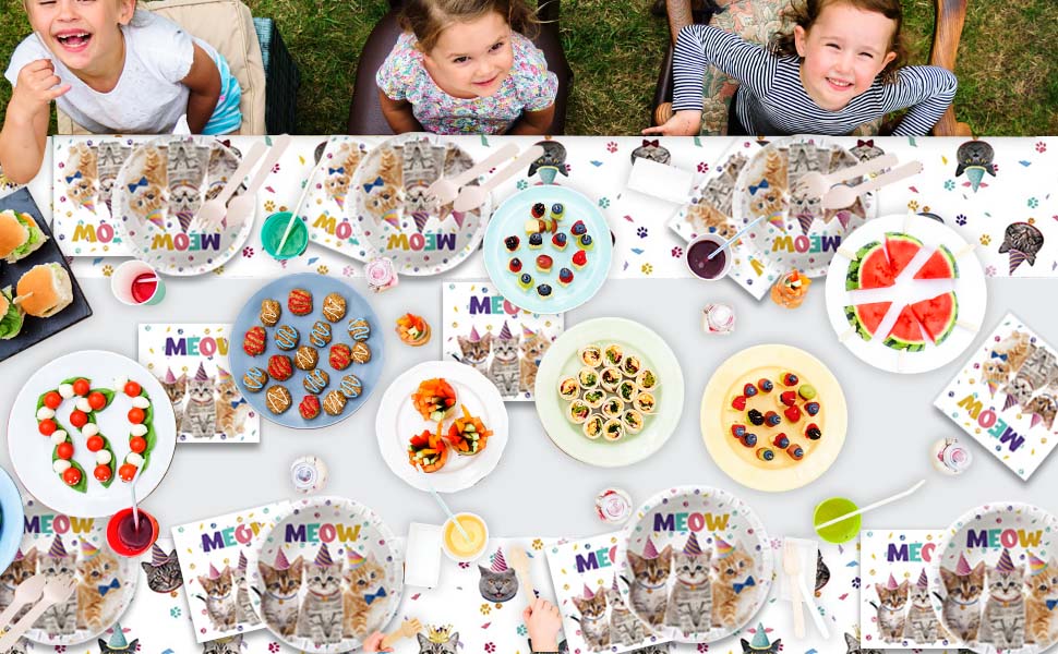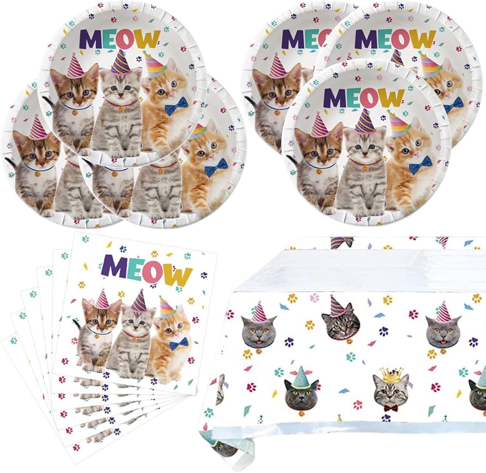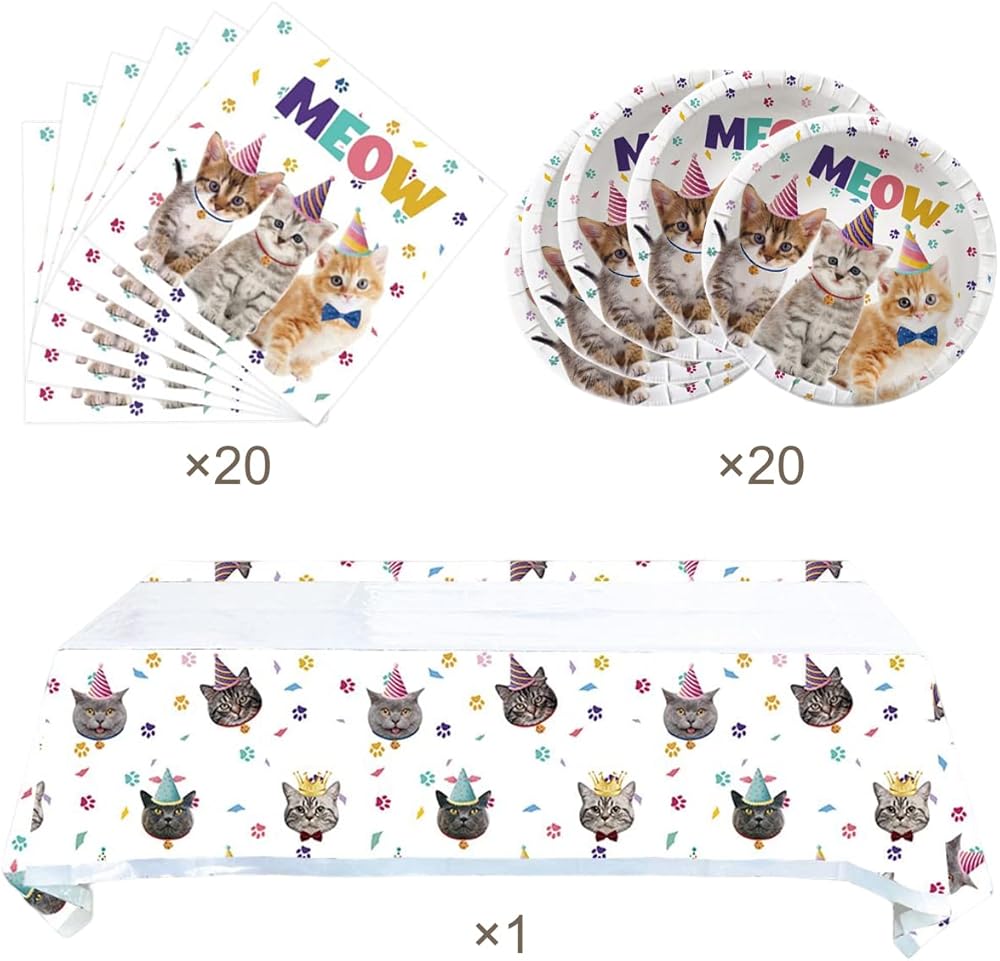 【What Will You Get】 Cat party decorations product includes 20pcs 7'' party plates, 20pcs napkins, 1pcs 71 '' x 42.5 '' tablecloths for Cat theme decorations