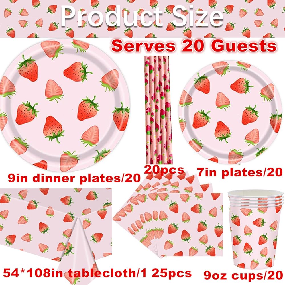 106PCS Strawberry Party Tableware: Strawberry party Tableware set serves 20 guests includeing 20 9in Strawberry dinner Plates x 20 Strawberry dessert plates x 20 Strawberry Cups x 25 Napkins x 20 Strawberry Straws x 1 tablecloth-total 106PCS,Your friends and customers will love it!