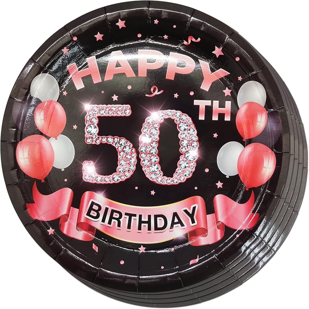 50th Birthday Plates Black and Pink Dessert, Buffet, Cake, Lunch, Dinner Plates for 50th Birthday Decorations Party Supplies, Happy 50th Birthday! 50 Count, 9" Plate Design for 50th Birthday Party
