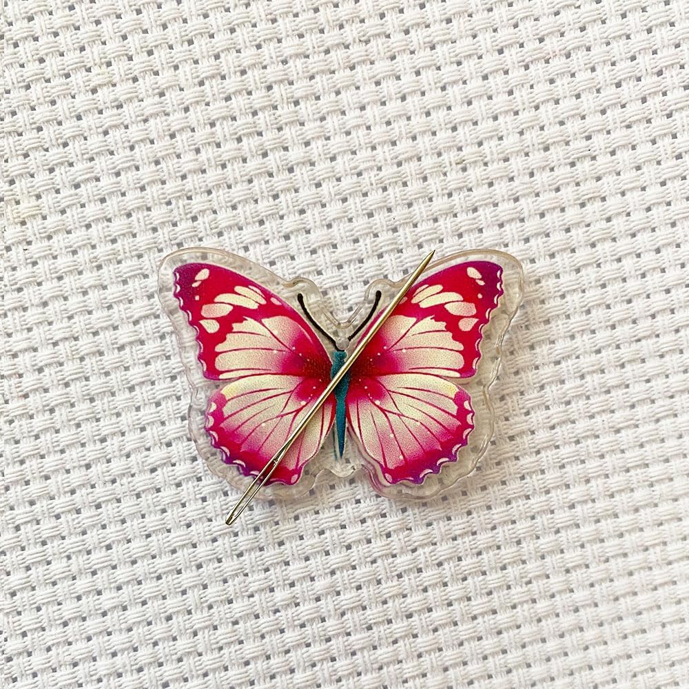 This Needle Minder comes in two parts. a cute butterfly with a magnet attached to the back, and the other magnet goes on the reverse of your work anchoring the needle minder in place.