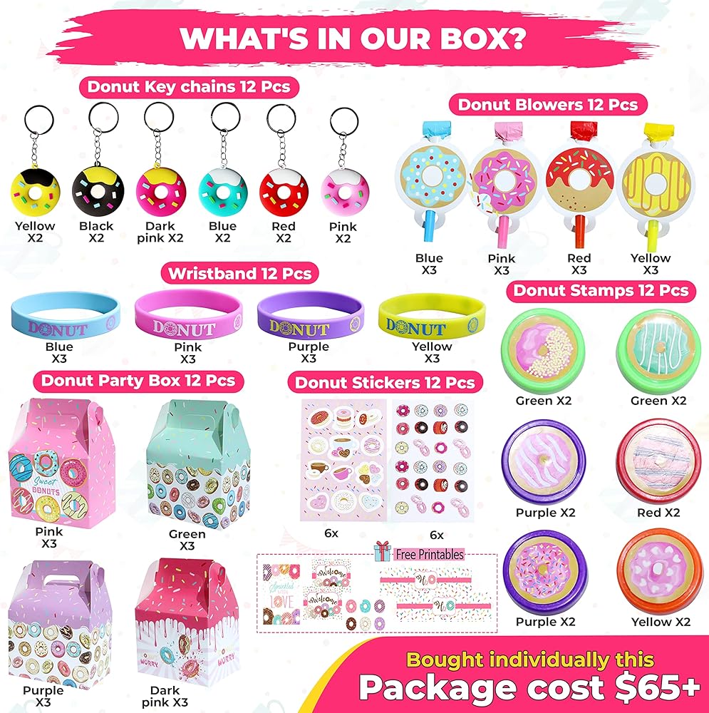 🎂 DONUT PARTY FAVORS SET : Include 12 x Donut Wristband, 12 x Donut keychain, 12 x Donut stickers, 12 x Donut stampers, 12 x Donut Party Blowout, 12 x Donut Boxes. Make your Donut Grow Up party the best one!