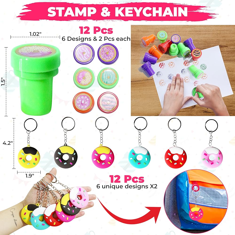 72 Pcs Donut Party Favors, Donut Birthday Supplies - 12 Sets of Stampers Keychain Blow out Stickers Wristband for Boy Girl Sweet Doughnut Birthday Party Gift Treat Box Pinata Goodie Bag Fillers