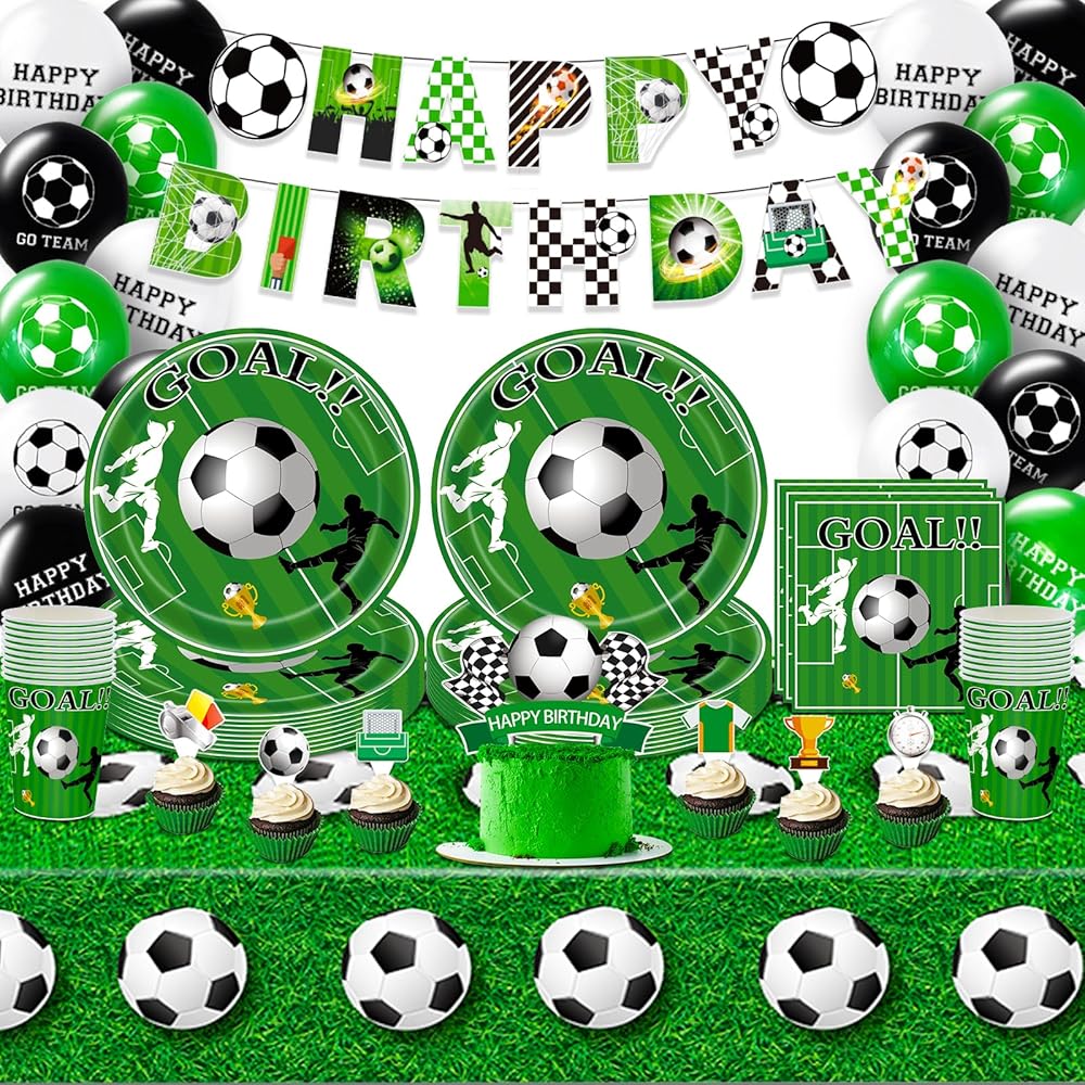 Premium Quality Soccer Decorations - The vibrant soccer birthday banner, plates, cups are made of high quality cardboard paper with no bad smells, lightweight, sturdy, bright color and well printed. The soccer table cloth is non-toxic and safe to everyone. Soccer cake decorations some of them are durable and resuable. The vibrant colors and detailed designs make for visually appealing decorations that will impress your guests.