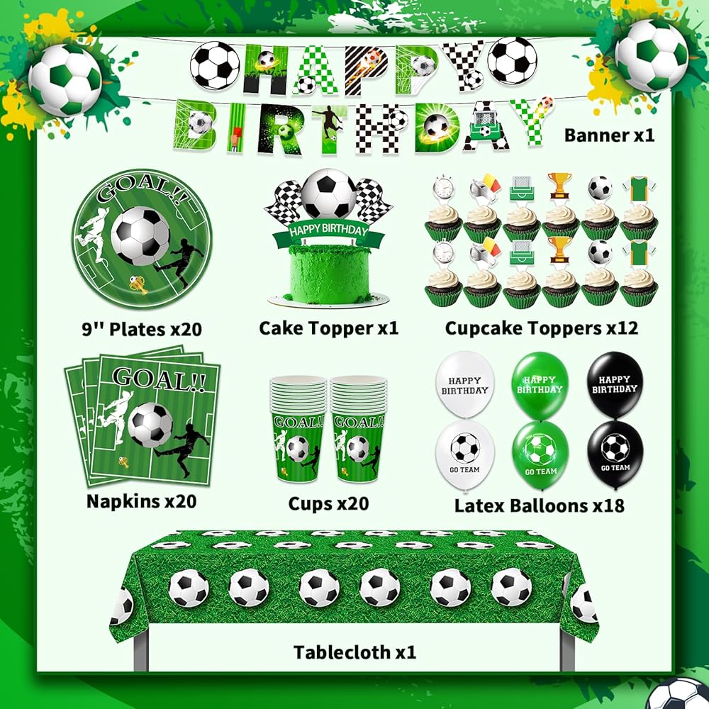 Complete Soccer Party Supplies - This soccer birthday party pack comes with everything you need to throw an exciting soccer-themed celebration. It includes 1pc of banner, 18pcs of balloons, 1pc of cake topper, 24pcs of cupcake toppers, 20pcs soccer plates, 20pcs napkins, 20pcs cups, and 1pc of tablecloth, ensuring that you have all the essentials for serving up to 20 guests.