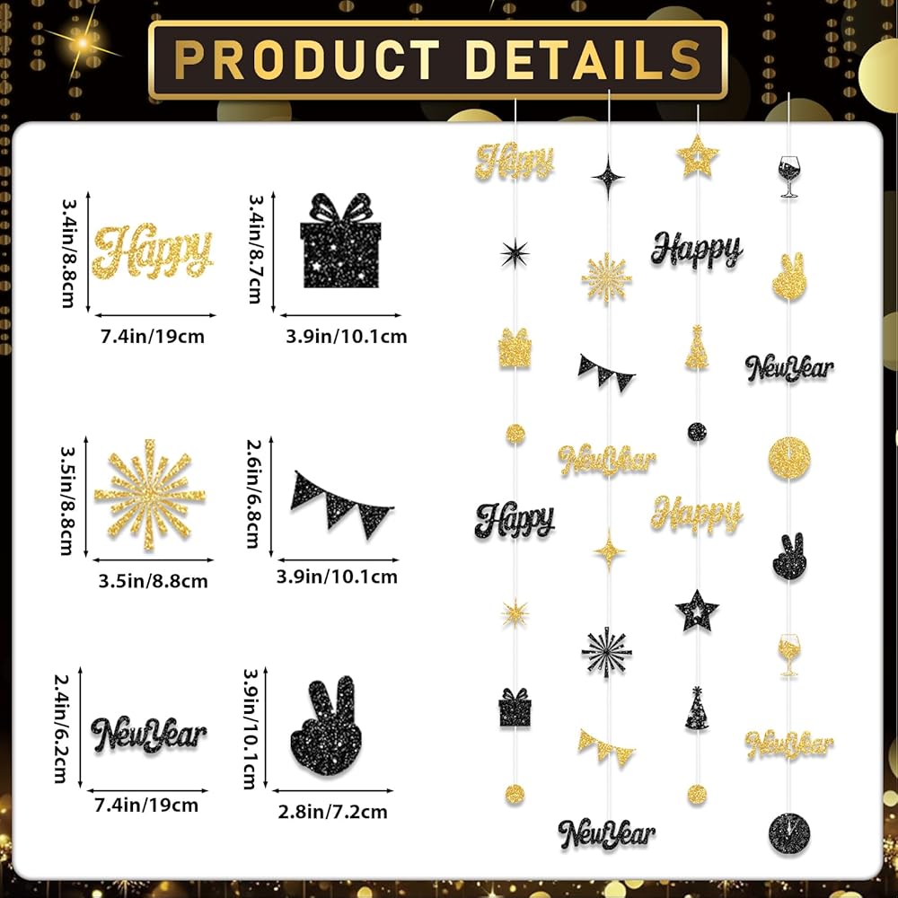 Package include: Our New Years Eve Party Decorations banner package contains 1 goodbye 2023 welcome 2024 happy new year Banner. Length of New Years Eve Party Decorations banner is 6.5 feet. 6 pcs new years eve party supplies 2024 hanging swirl. Each garland banner decoration size is about 6.5 feet perfect for new year party favors,new year birthday party decoratios.