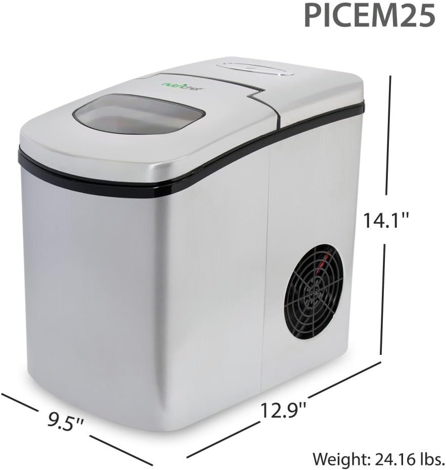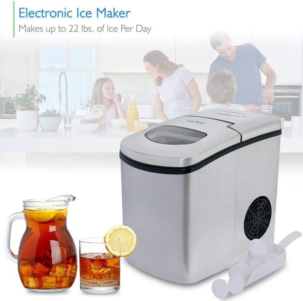 Keep the drinks chilled with the NutriChef Electronic Ice Maker. Simply plug it in and add water for instant ice-making ability. Hassle-free operation allows you to press a button and create pellet-shaped ice quickly. The stainless steel housing features a window to see the ice level capacity within the unit. The high-powered freezing element makes up to 22 pounds of ice in a day, ensuring all of your guests will enjoy crisp, chilled drinks. Perfect for any kitchen table or countertop. Add convenient kitchen style with the NutriChef Ice Maker.
