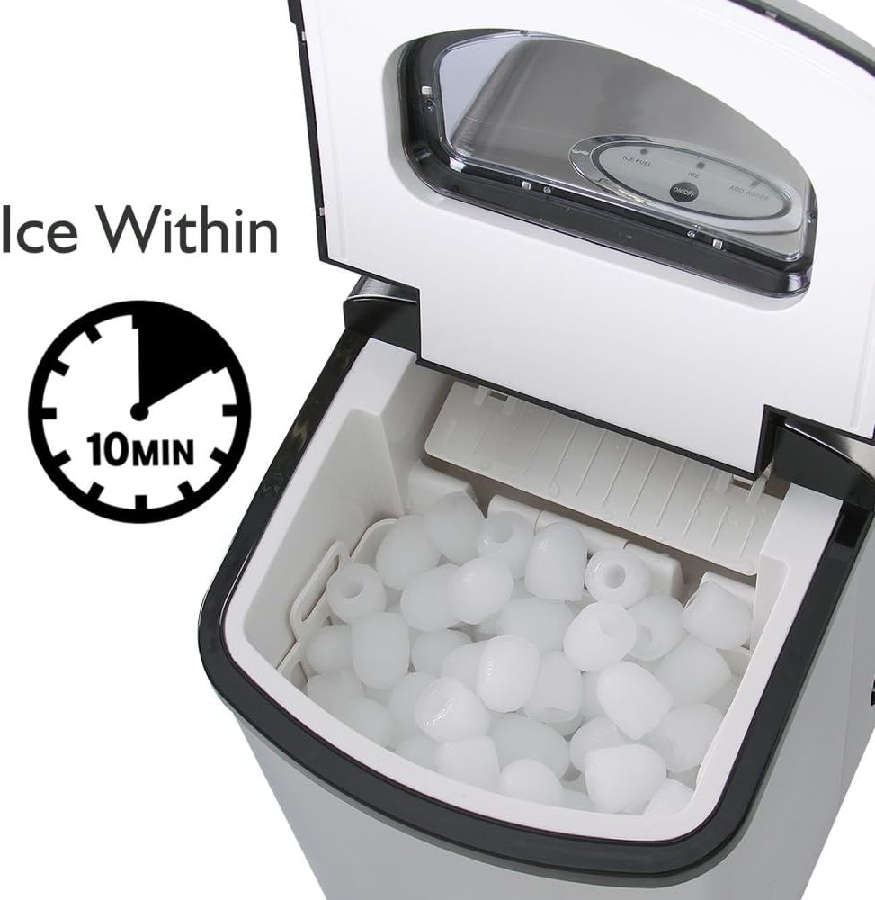 QUICK AND QUIET: Just add water, press the button and enjoy ice cubes in no less than 10 minutes! Ultra quiet operation gives you the convenience of a commercial ice maker without the noise.
