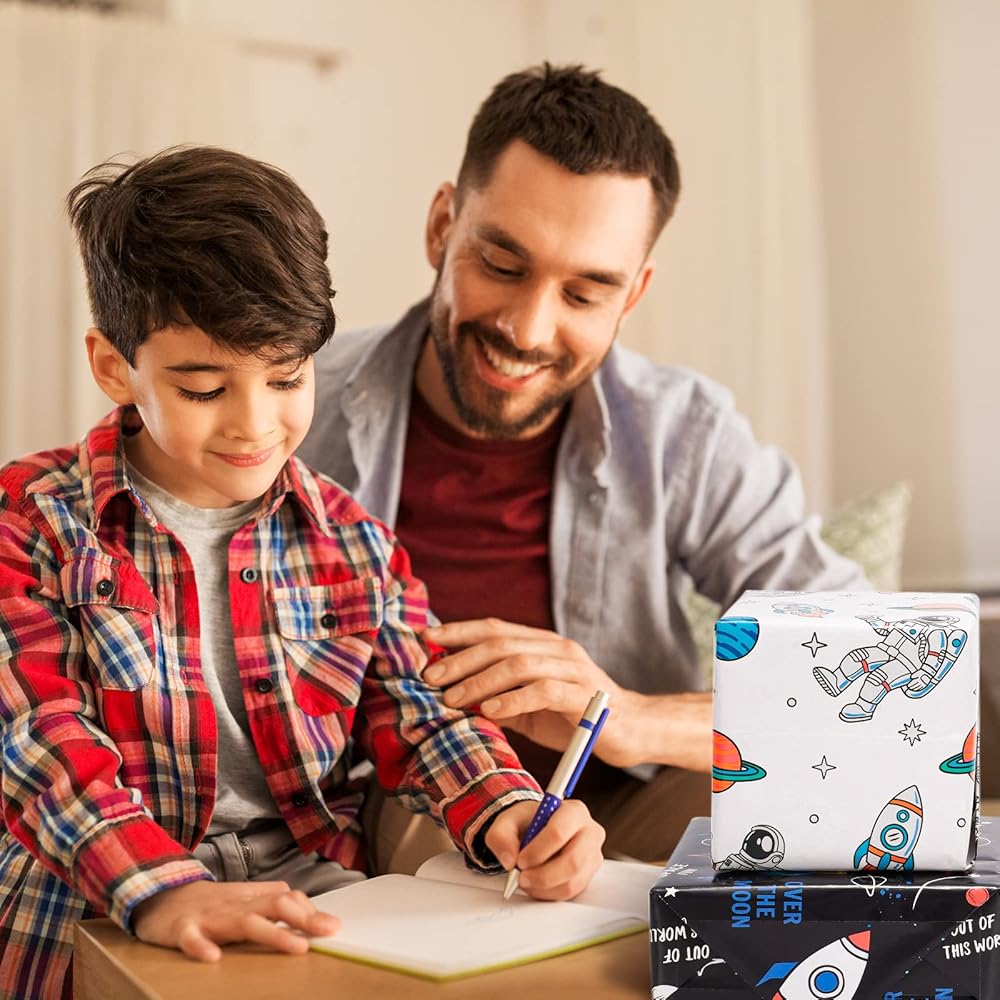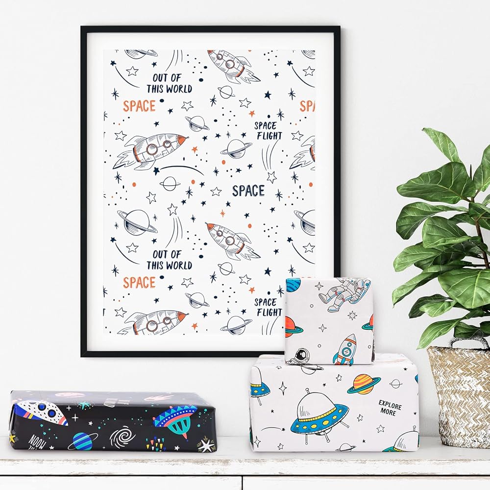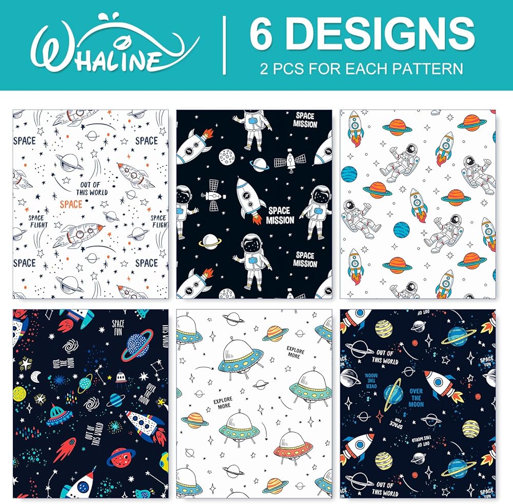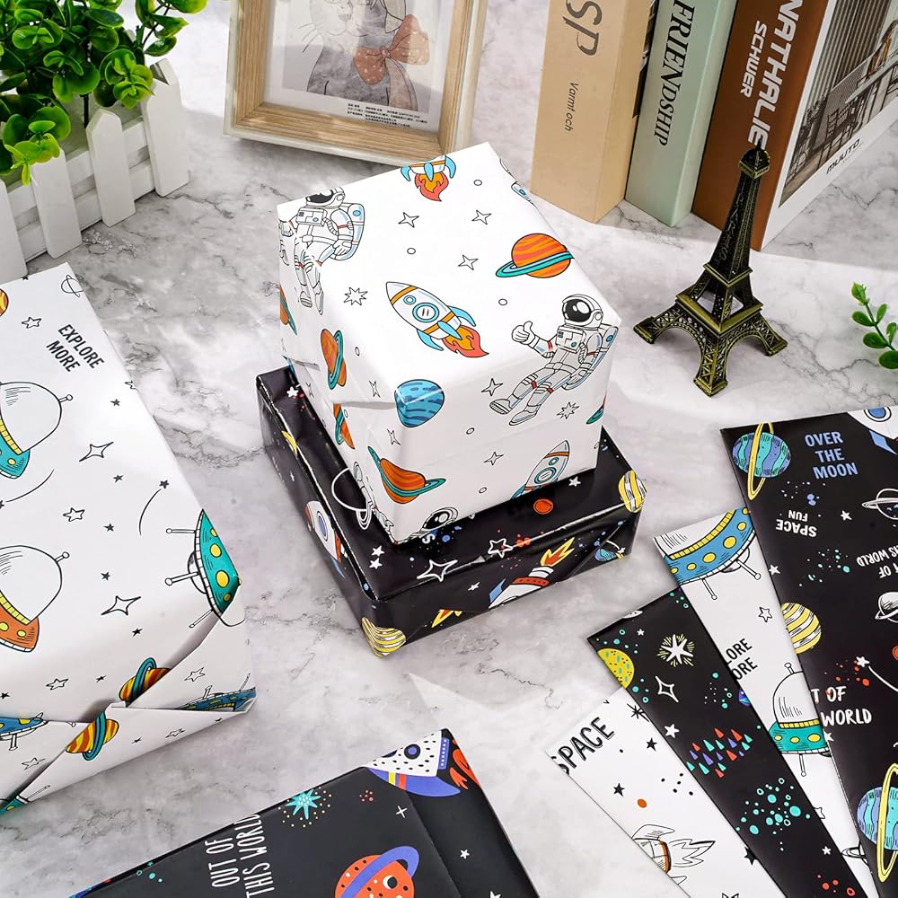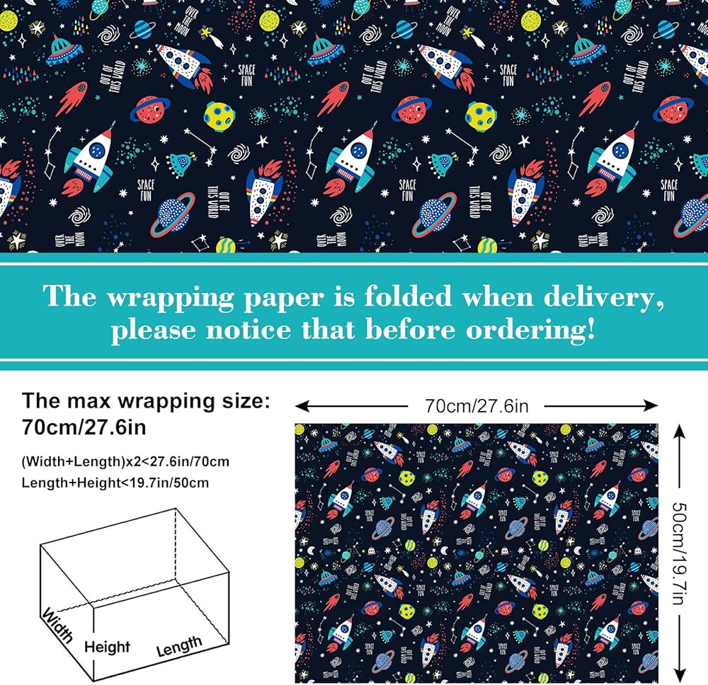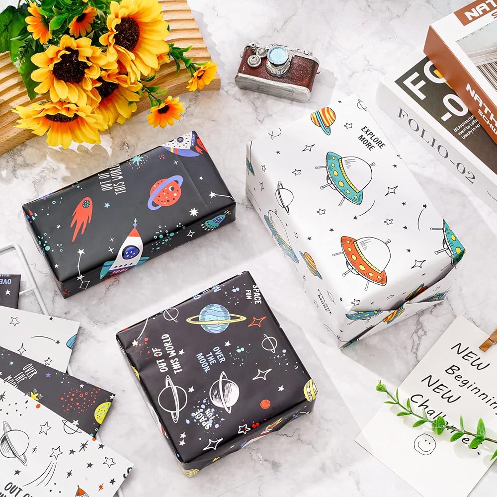 12 sheets outer space theme wrapping paper patterned with space elements, funny and delicate, wonderful for your gift wrapping.