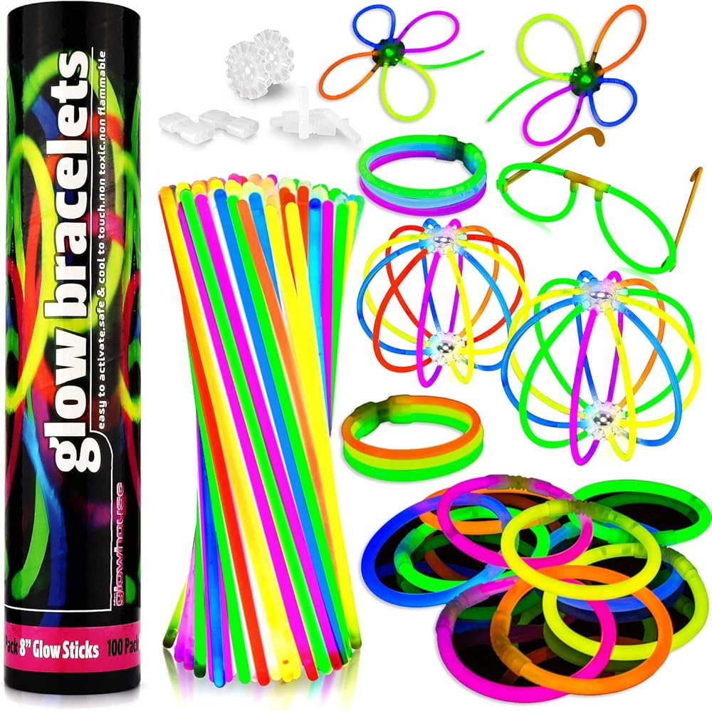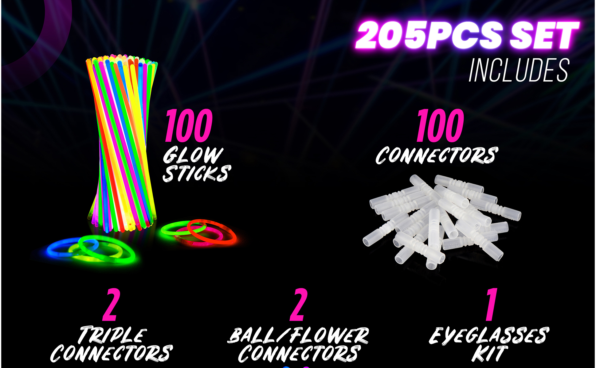 LARGE PARTY PACK: Includes 100 ultra-bright glow sticks and 105 various connectors (205 pieces in total) 100 Bracelet/necklace connectors, 2 x glow ball connectors, which will allow you to either create 1 x glow ball or 2 x glow flowers, 2 x triple bracelet connectors 1 set of glow glasses connectors.