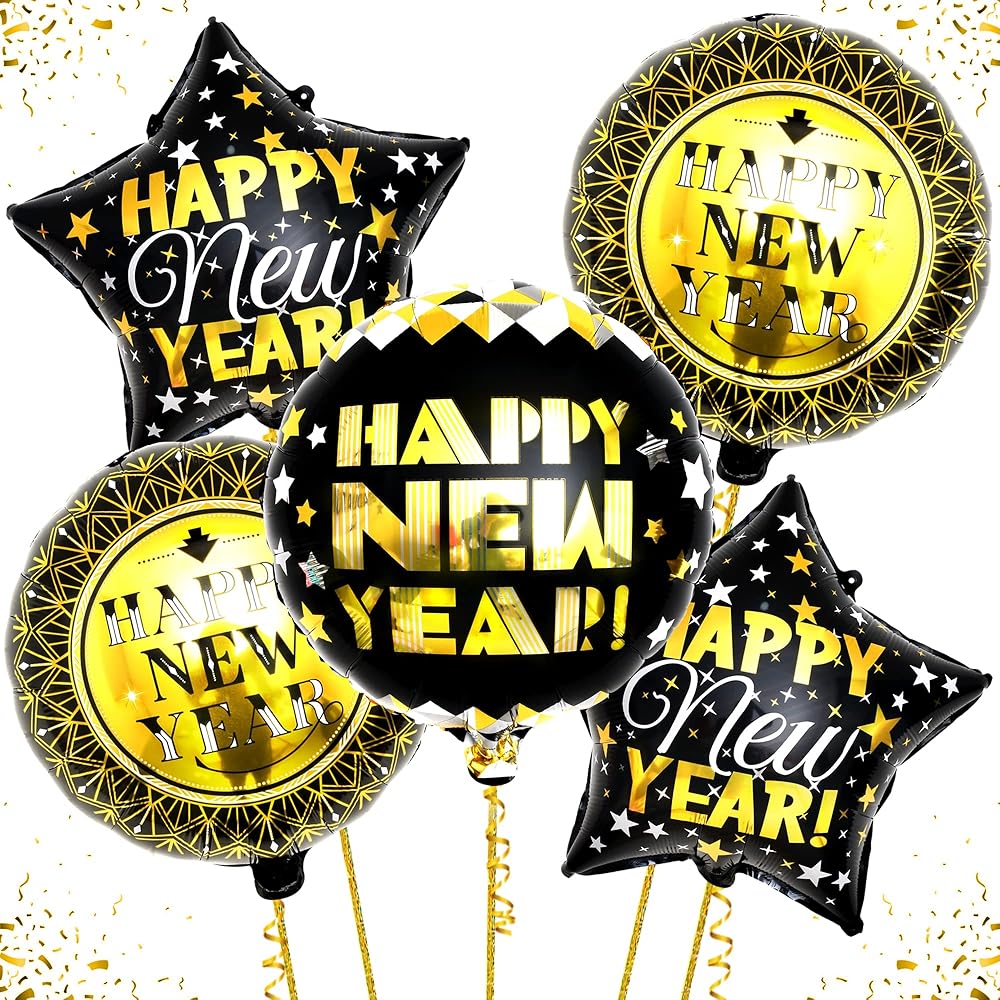 PACK OF 5 | HAPPY NEW YEARS BALLOONS : The New Years Ballons Decoration 2024 are available in different designs with Black and gold. Round Happy New Year foil balloons Pack of 2, Happy New Year Star Balloons, Pack of 2, Happy New Year Hat Balloons Pack of 1. The New Years Eve Balloons are made from aluminum mylar foil material, durable and reusable, you can use them several times as happy new year balloons for New year party decorations and many more