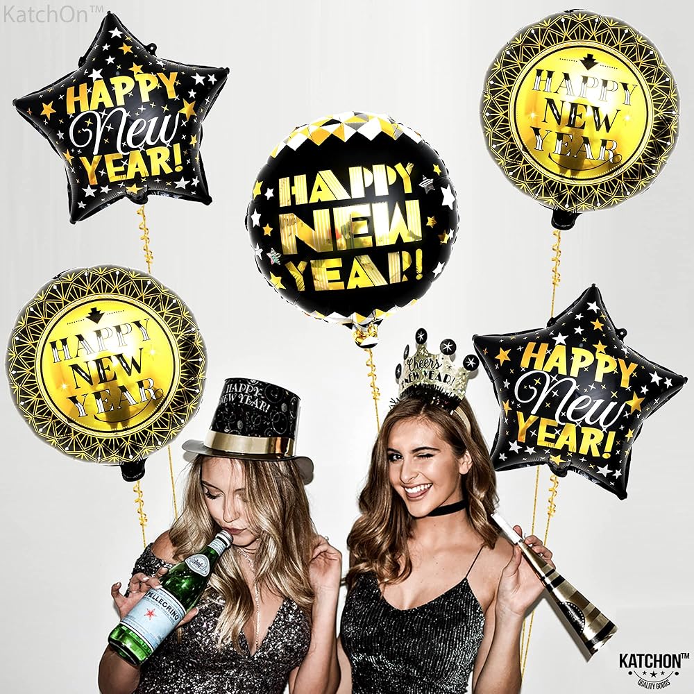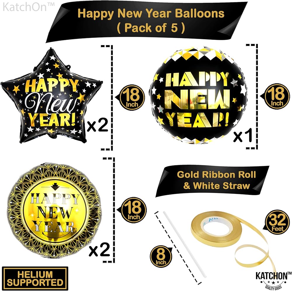 KatchOn, Black and Gold Happy New Years Balloons - 18 Inch, Pack of 5 | Happy New Year Balloon for New Years Eve Party Supplies 2026 | New Year Decorations 2026 | NYE Balloons Decorations 2026