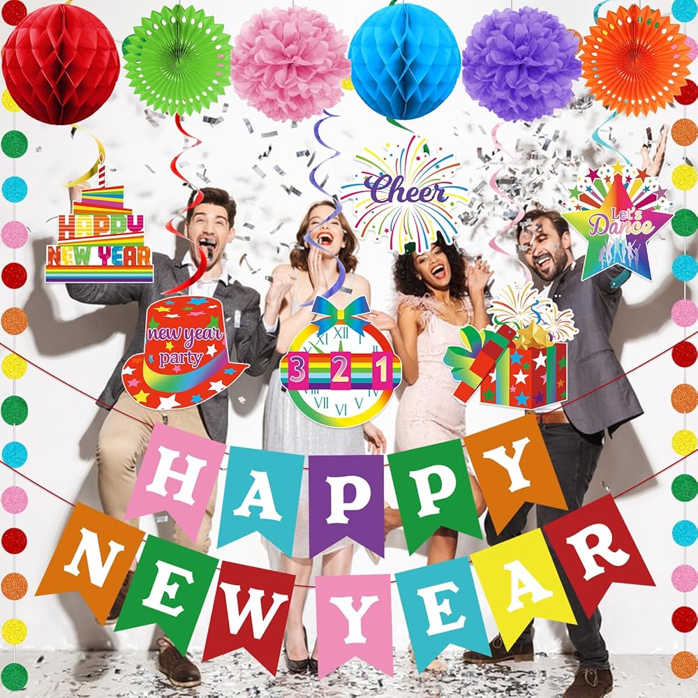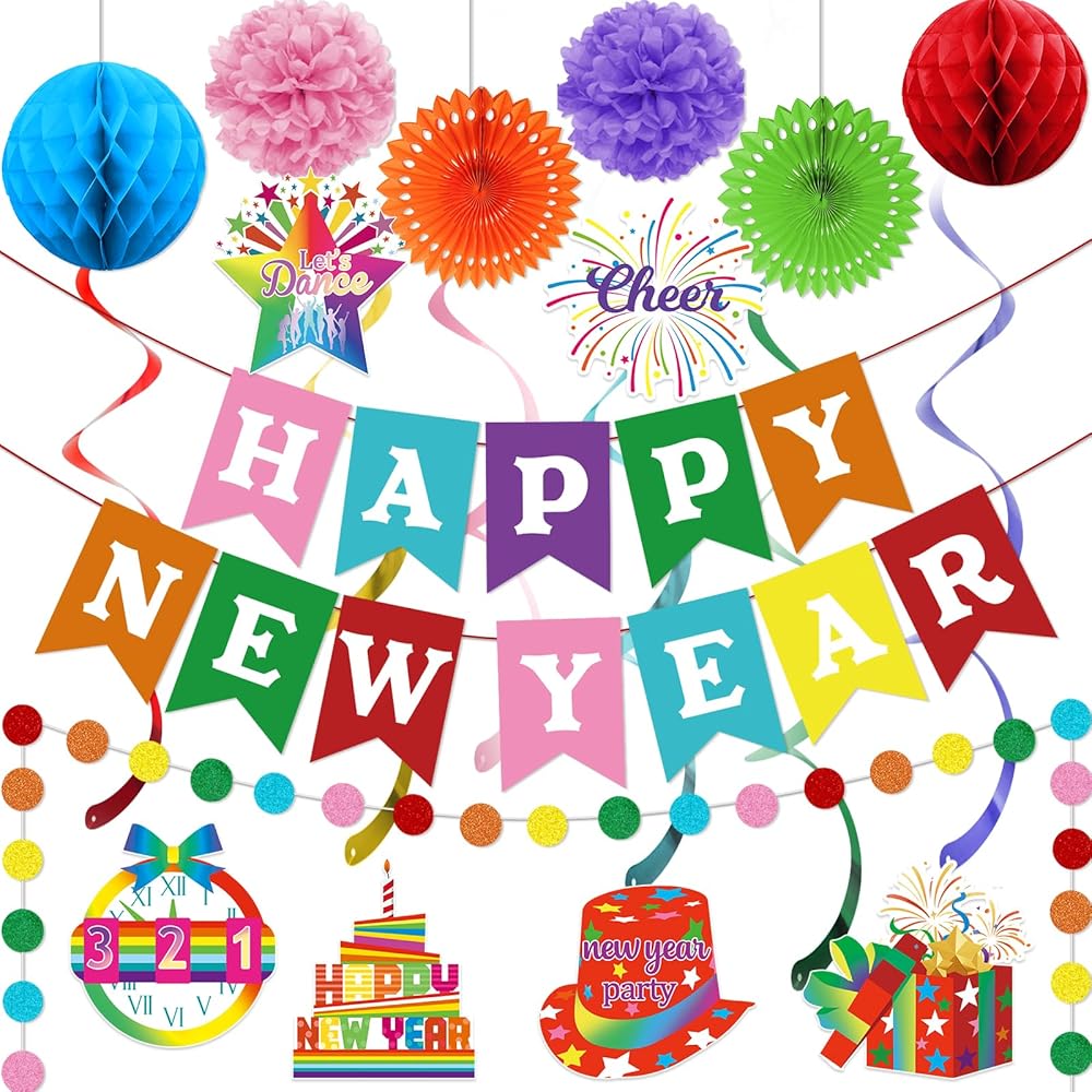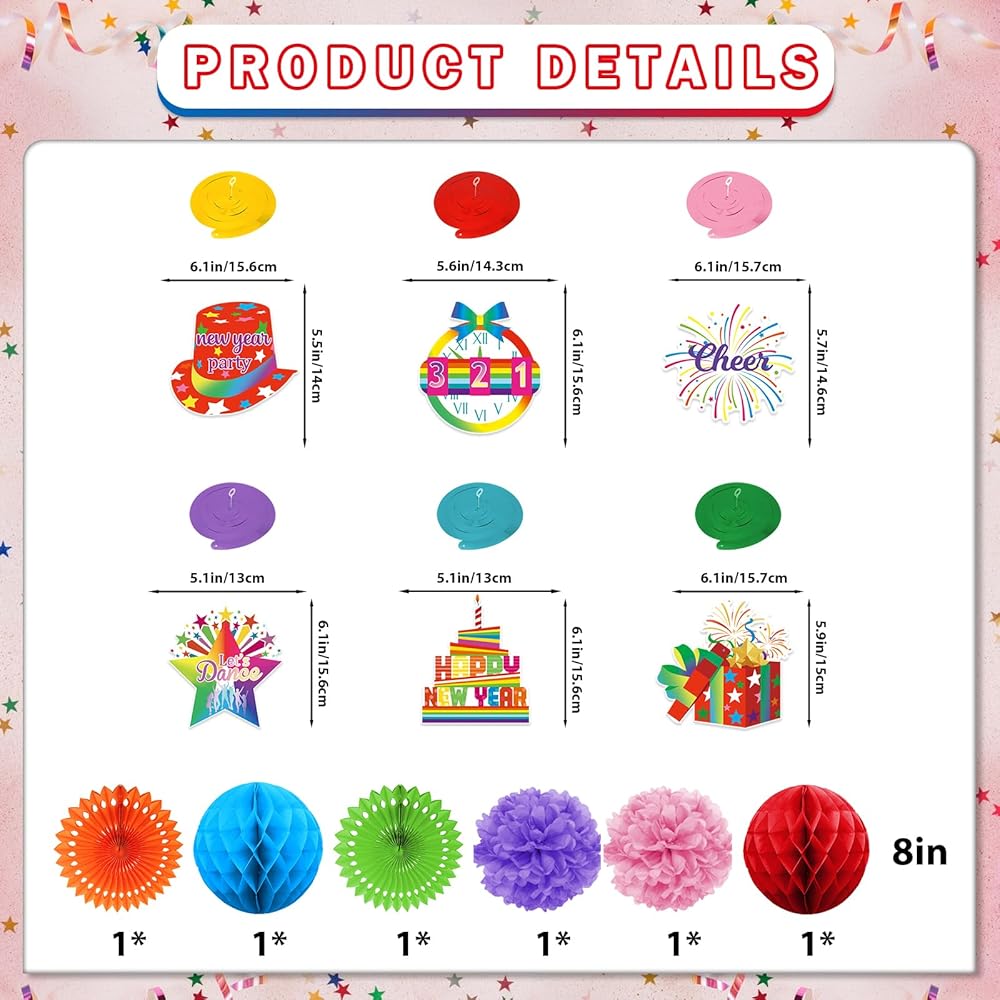 Ready to hang:Colorful and bright new year decorations, Perfect for new year party favors,new year birthday party decoratios.The warm and joyful will attract all the attention in the room.Perfect for your new year eve party decorations. Exquisite new year eve party supplies set must make an unforgettable moment for your party!